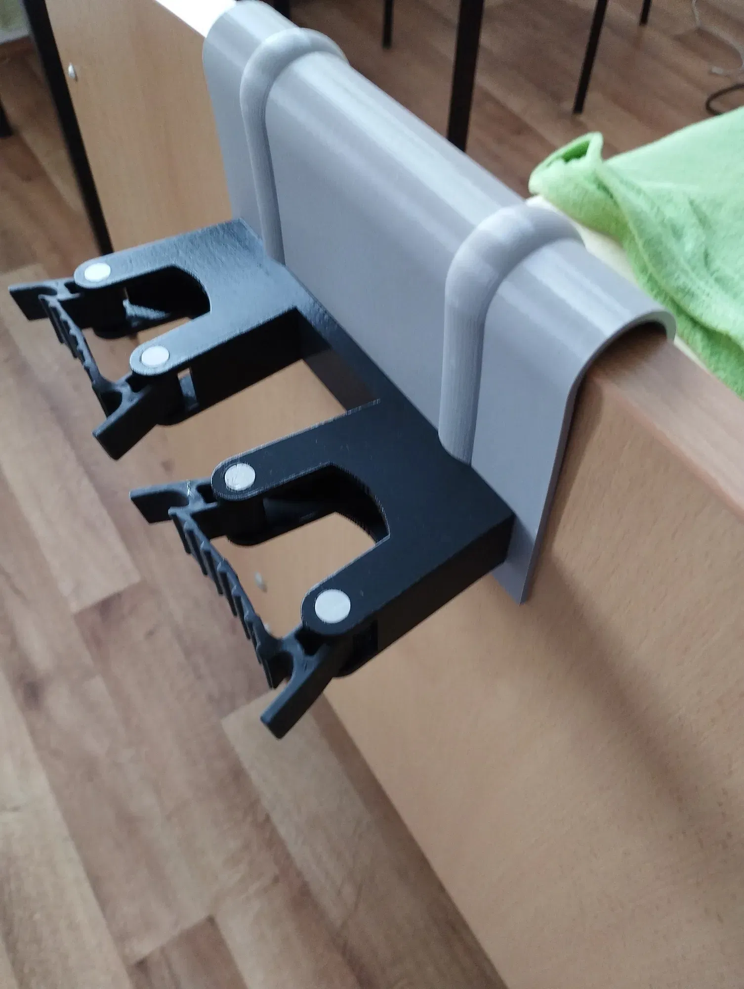 K tomuto držáku jsem vytvořil na žádost desku k montáži držáku. Tím se dá držák pověsit na postel (cca 4cm tloušťka desky) nebo bočnici postele. Případně jde zavěsit na opěradlo židle.