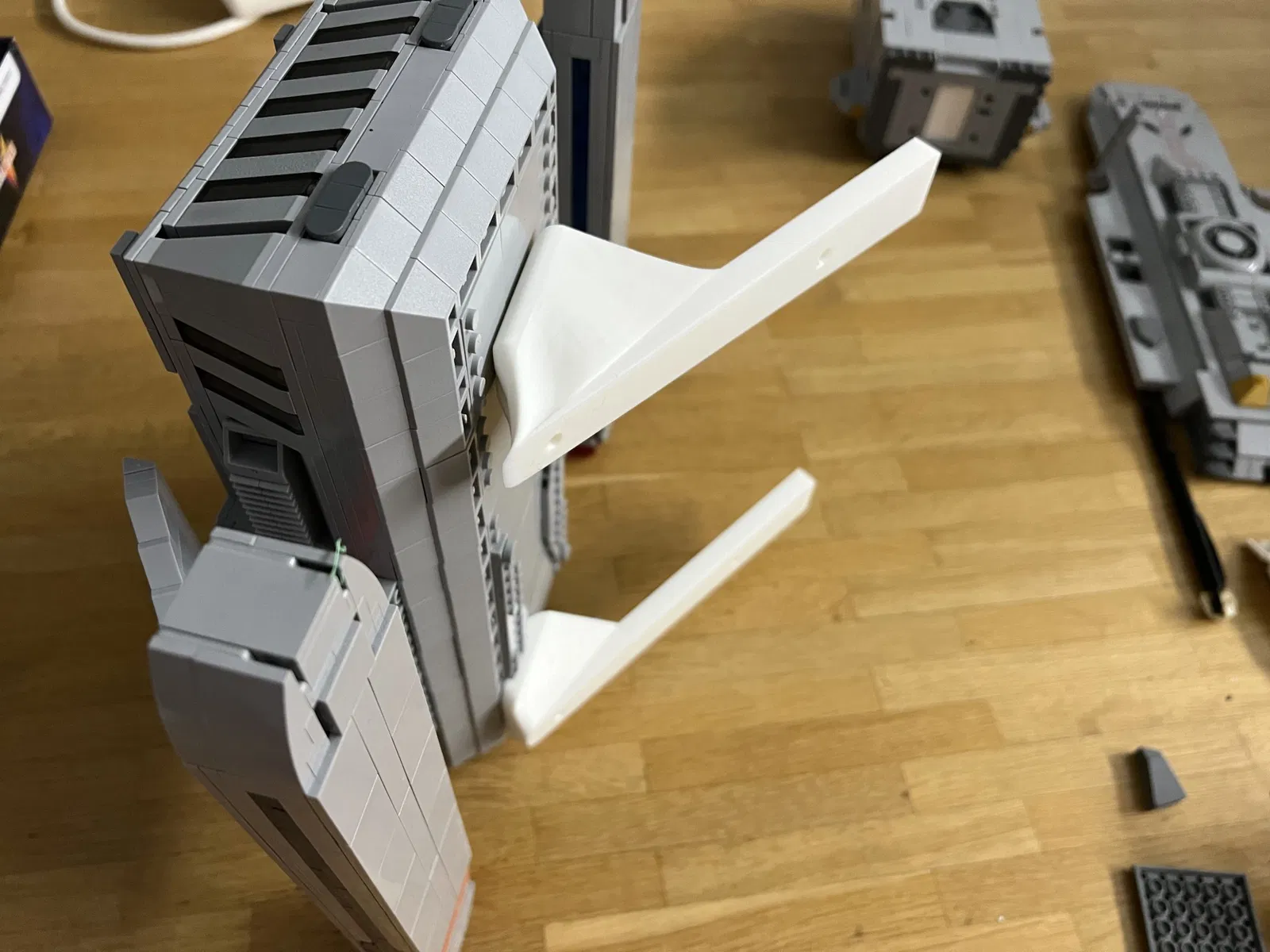 Hai phần này khớp vào các cục nhô ra ở mặt dưới của bộ Star Trek Runabout của BlueBrixx và vào các giá treo tường SIBBHULT của IKEA (18x18cm). Với những thứ này, bạn có thể treo bộ mô hình lên tường ở góc 45 độ.