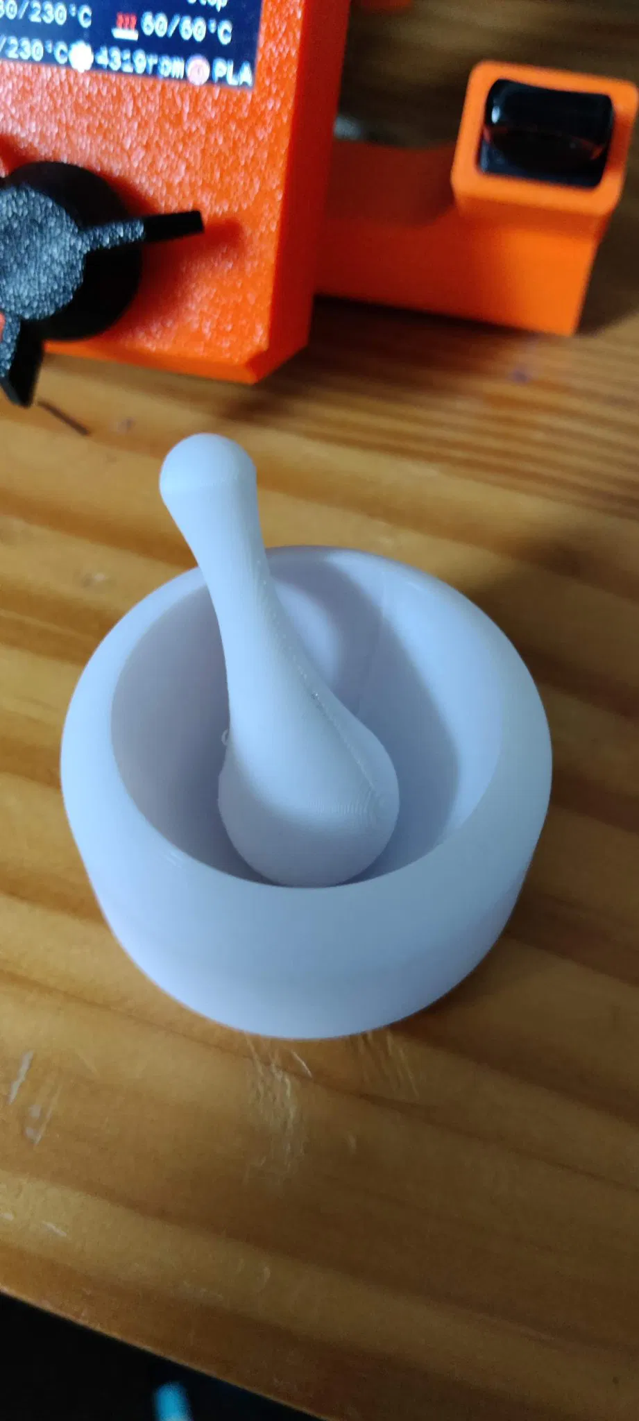 Bộ chày và cối 3D, được in theo chiều ngang với đế đỡ và có gia cố độ đặc 100% ở phần đáy chày và cối bằng modifier. Thích hợp cho các bản in cần sự chắc chắn và bền bỉ.
