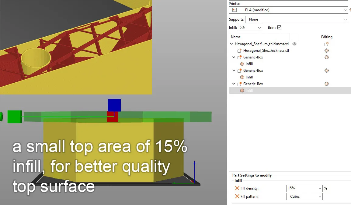 Xem hình để hiểu rõ các khu vực infill cần thay đổi bằng modifier box, bạn có thể tìm trên YouTube cách làm, bạn chỉ cần chuột phải vào STL trong prusaslicer > add modifier > box; chỉnh kích thước tương ứng và thay đổi tỉ lệ infill.