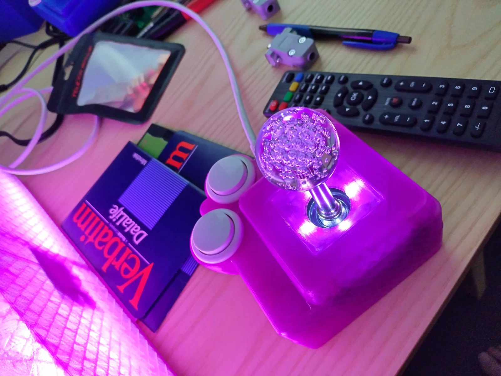 Cái joystick Apple II này được làm dựa trên joystick Apple IIe đời đầu. Mình dùng cái nút joystick này https://a.aliexpress.com/_ mLzlATI và mấy nút arcade 25mm rẻ tiền có sẵn. Về cách đấu dây và tính toán điện dung thì mình làm theo hướng dẫn của trang blondihacks.com/apple-ii-gamepad-prototype/.