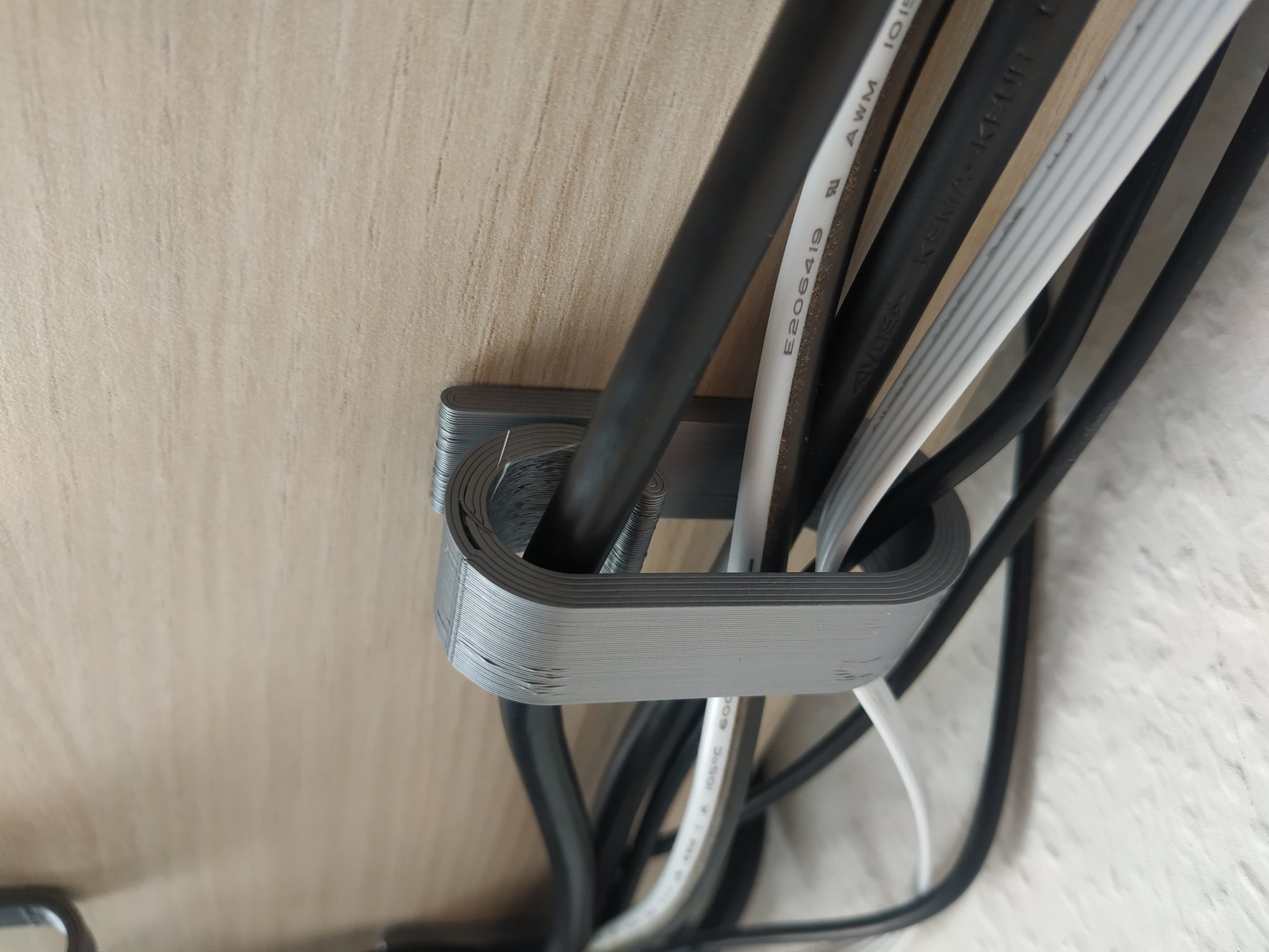 Kẹp giữ dây cáp để gắn dưới bàn. Sản phẩm được in với tốc độ nhanh và độ cao lớp 0.3 mm, có thể cần dùng brim. Dán bằng keo nến để cố định, có thể gỡ bỏ dễ dàng mà không để lại lỗ khoan. Có phiên bản bắt vít sẵn.