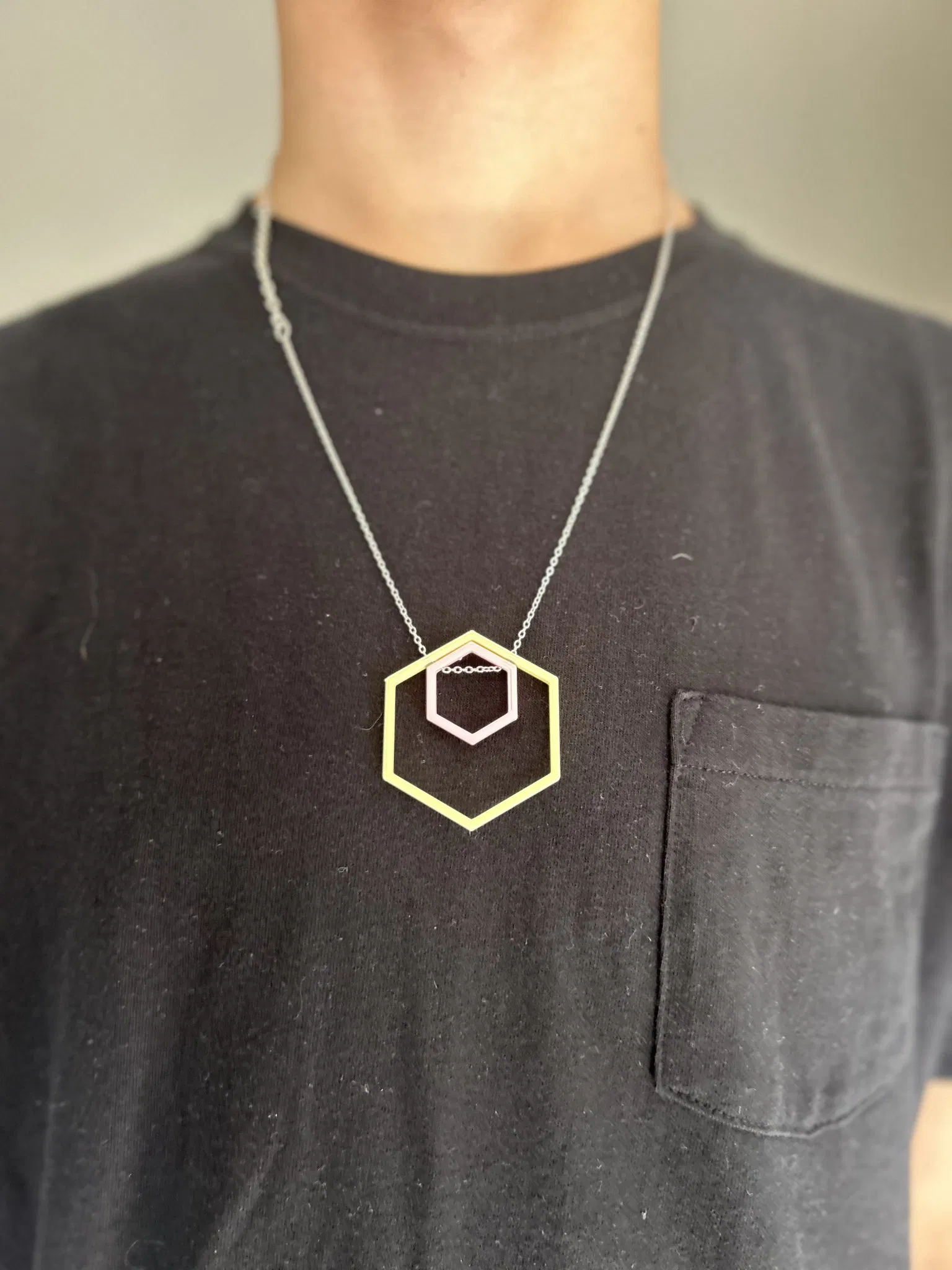 Double Hexagon Necklace! You will need to thread the chain through both holes of the hexagons. This pendant prints SUPER quickly too, so it's very easy to mix and match colors.