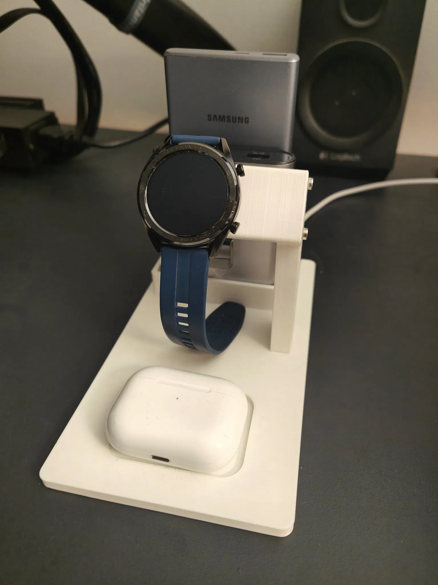 Chân đế để bàn sạc Huawei Watch GT, có chỗ cất tai nghe AirPods và 2 cục sạc dự phòng. Giúp bàn làm việc của bạn gọn gàng hơn.