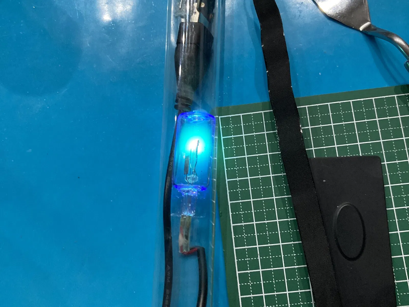 Mô hình này là một bóng đèn UV được đặt trong ống nghiệm, dùng để khử trùng nước trong bình chứa của máy pha cà phê espresso. Hướng dẫn chi tiết các bước lắp ráp và vật liệu cần thiết, nhấn mạnh việc sử dụng TPE cho bộ phận đệm để đảm bảo độ bền và khả năng chống tia UV.
