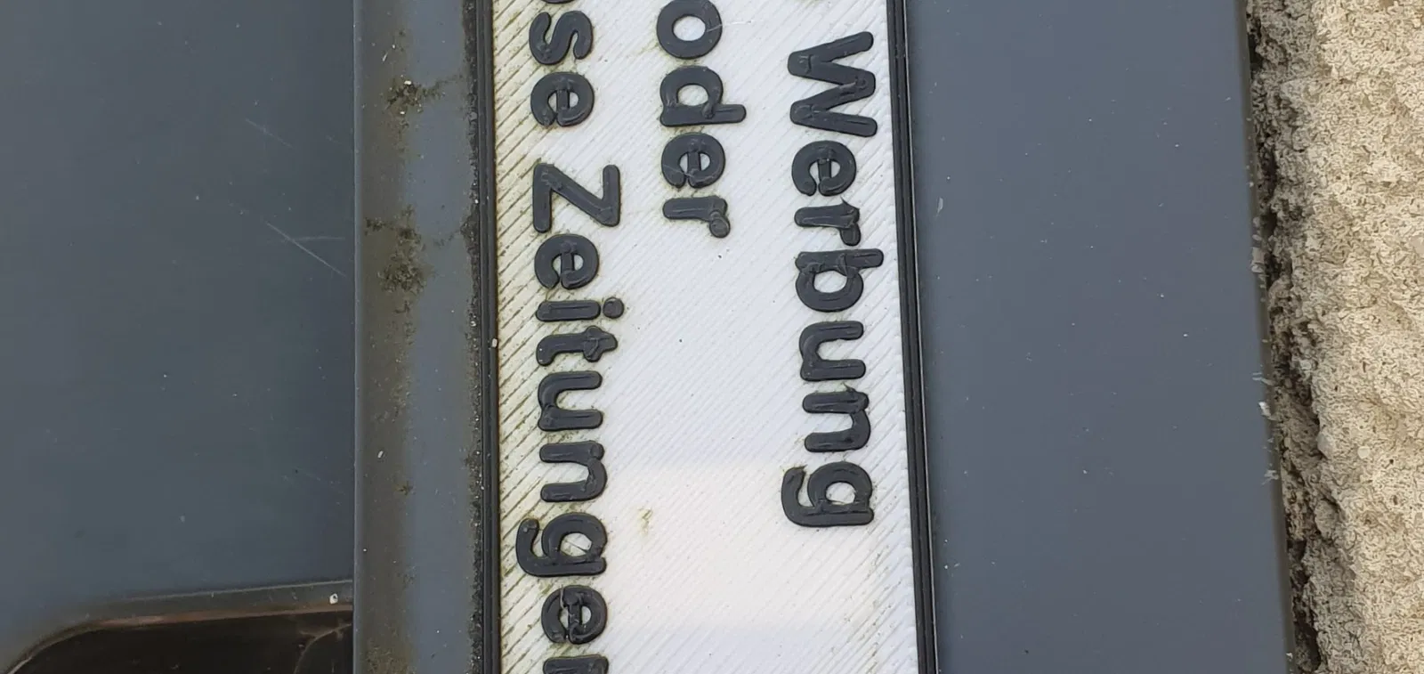 Biển hiệu trong bức ảnh mẫu được in bằng PLA và đã treo ở hộp thư được gần 12 tháng.