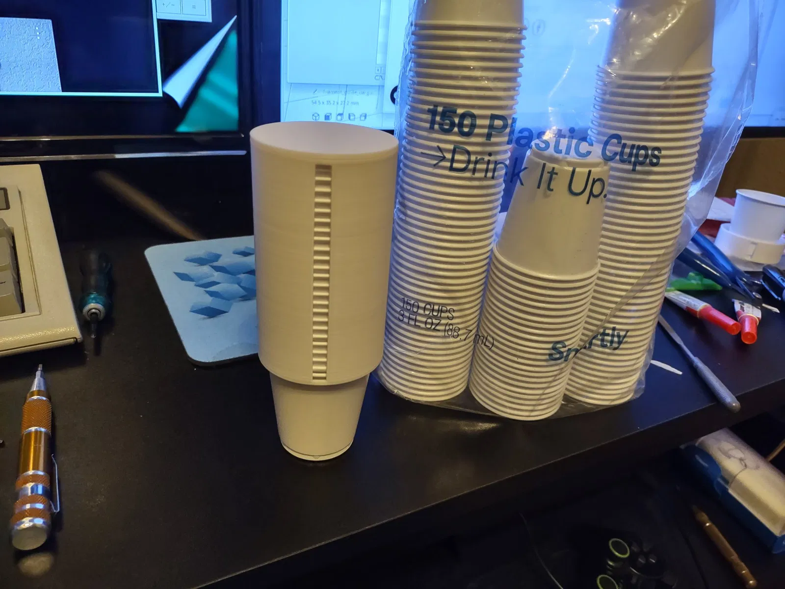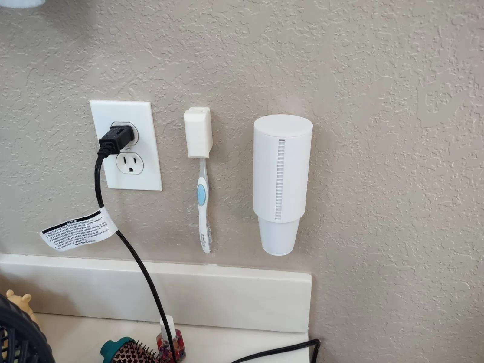 Đây là một giá đựng cốc dự định treo trên tường phía trên bàn trang điểm của vợ tôi trong phòng tắm. Nó được thiết kế để phù hợp với những cốc nhựa 3oz từ Walmart, nhưng tôi chắc chắn nó có thể dễ dàng điều chỉnh để phù hợp với các loại cốc khác.