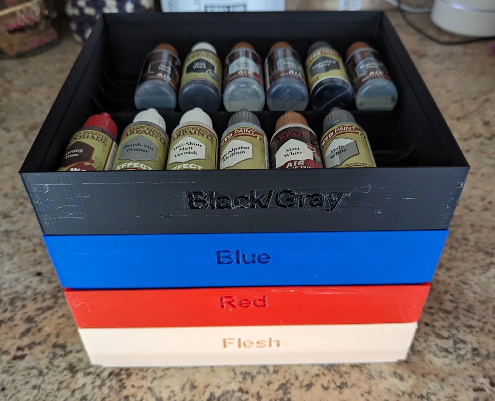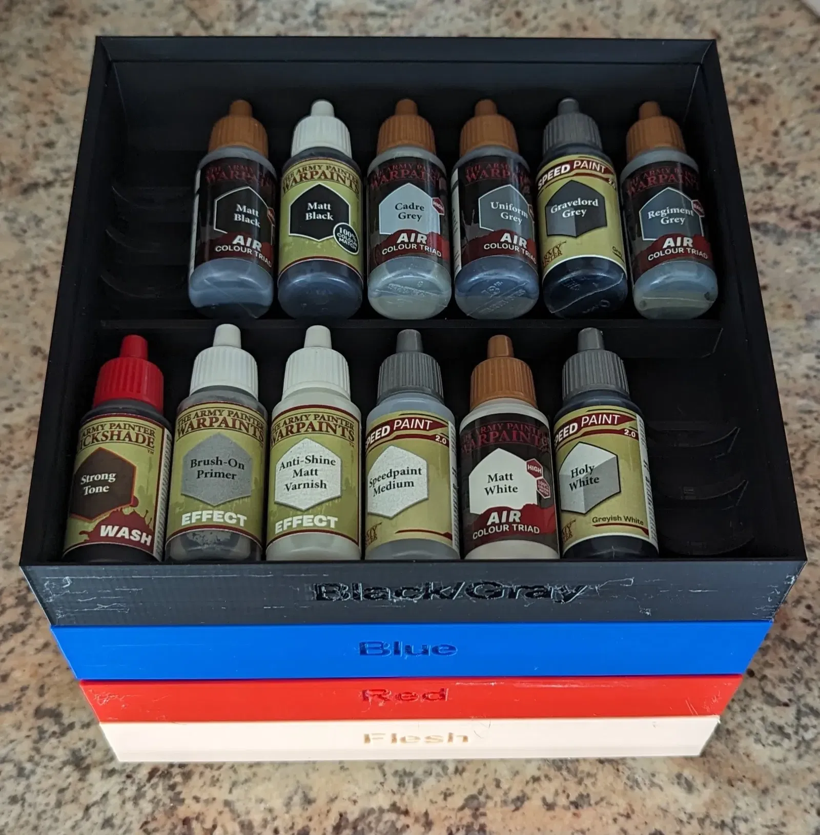 Mẫu kệ xếp chồng độc đáo, thiết kế riêng cho các chai sơn Army Painter, giúp bảo quản gọn gàng trên bàn làm việc hoặc trong hộp. Dễ dàng lấy sơn và tùy chỉnh theo nhu cầu.