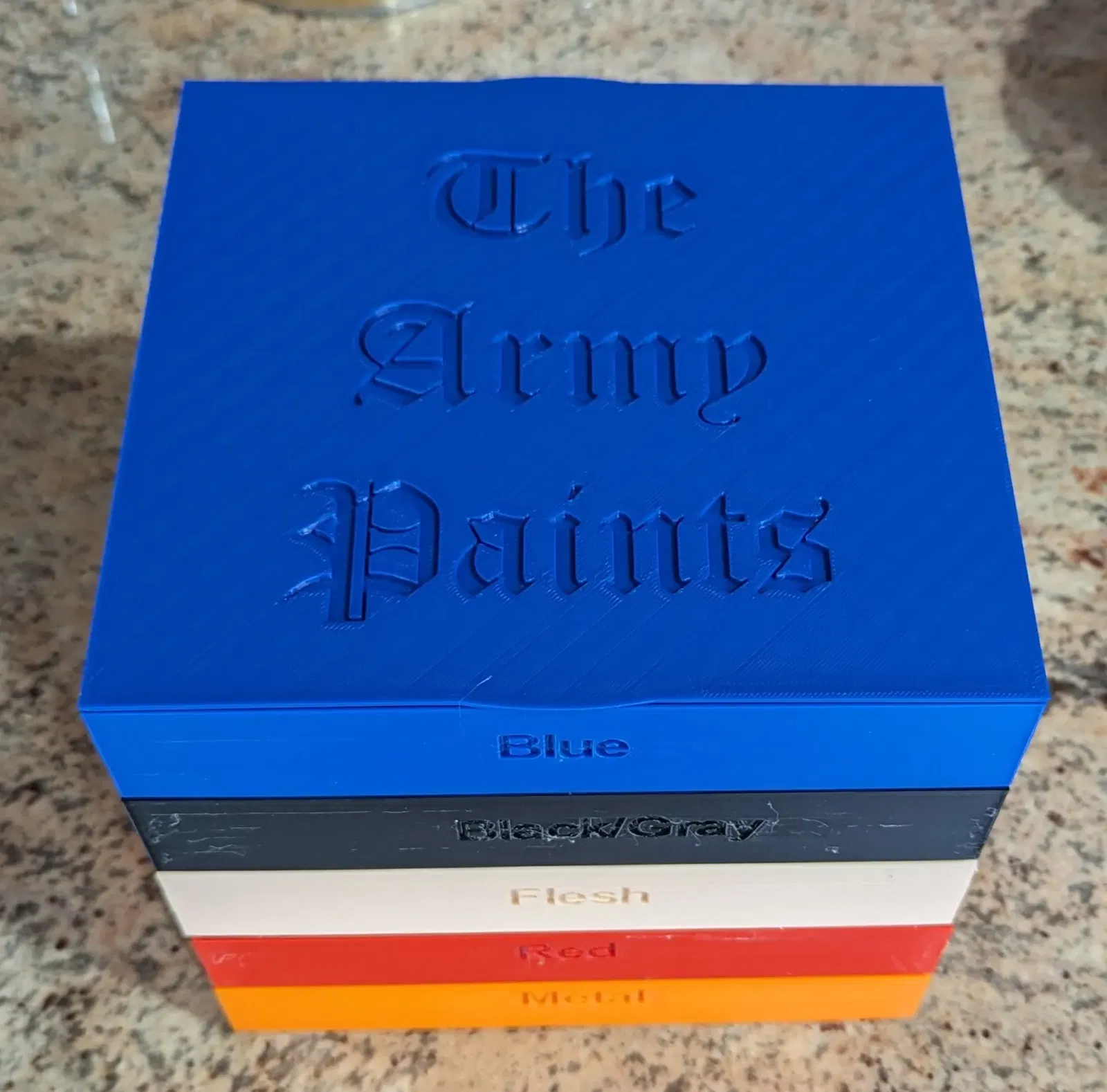 Tao muốn làm một cái kệ xếp chồng lên nhau cho mấy chai sơn của tao (mỗi cái 14 chai). Tao hay để trong hộp đựng đồ nhưng cái này xếp chồng lên nhau cũng gọn gàng để trên bàn. Mày có thể in một cái cho mỗi màu, không cần quá to, vì tao có thể in thêm cái nữa nếu cần. Mấy chai sơn được đặt sao cho mày có thể nhấn vào đáy chai và phần trên sẽ bật lên để lấy sơn ra. Đáy chai cũng đủ lộ ra để thấy màu sơn bên trong. Phần đỡ chai phía trên có gờ, nên chai sơn không bị trượt lên quá cao. Tao có thêm chỗ để ghi tên màu lên hộp, cũng như in màu đó lên. Thành hộp đủ cao để khi xếp chồng lên nhau, các hộp không bị chạm vào chai sơn. Phần thành và đáy hộp được vát mép để chúng lồng vào nhau đủ chắc chắn. Thành và đáy hộp còn được vát thêm để tăng độ vững chãi ở các góc bên hông, vì tao đã chỉnh dung sai hơi khít lúc tinh chỉnh thiết kế. (Nhìn hình thì mấy cái hộp màu đỏ và màu da là bản đầu, lúc đó phải chỉnh lại chiều cao và các vát mép). Màu xanh dương và đen là thiết kế mới nhất (v19... ừm, 19 lần chỉnh sửa). Mấy cái đế đỡ chai sơn là dạng sọc, để giảm lượng vật liệu và thời gian in. File gốc Autodesk Fusion 360 đính kèm để mày có thể thêm màu hoặc đổi chữ theo ý.
