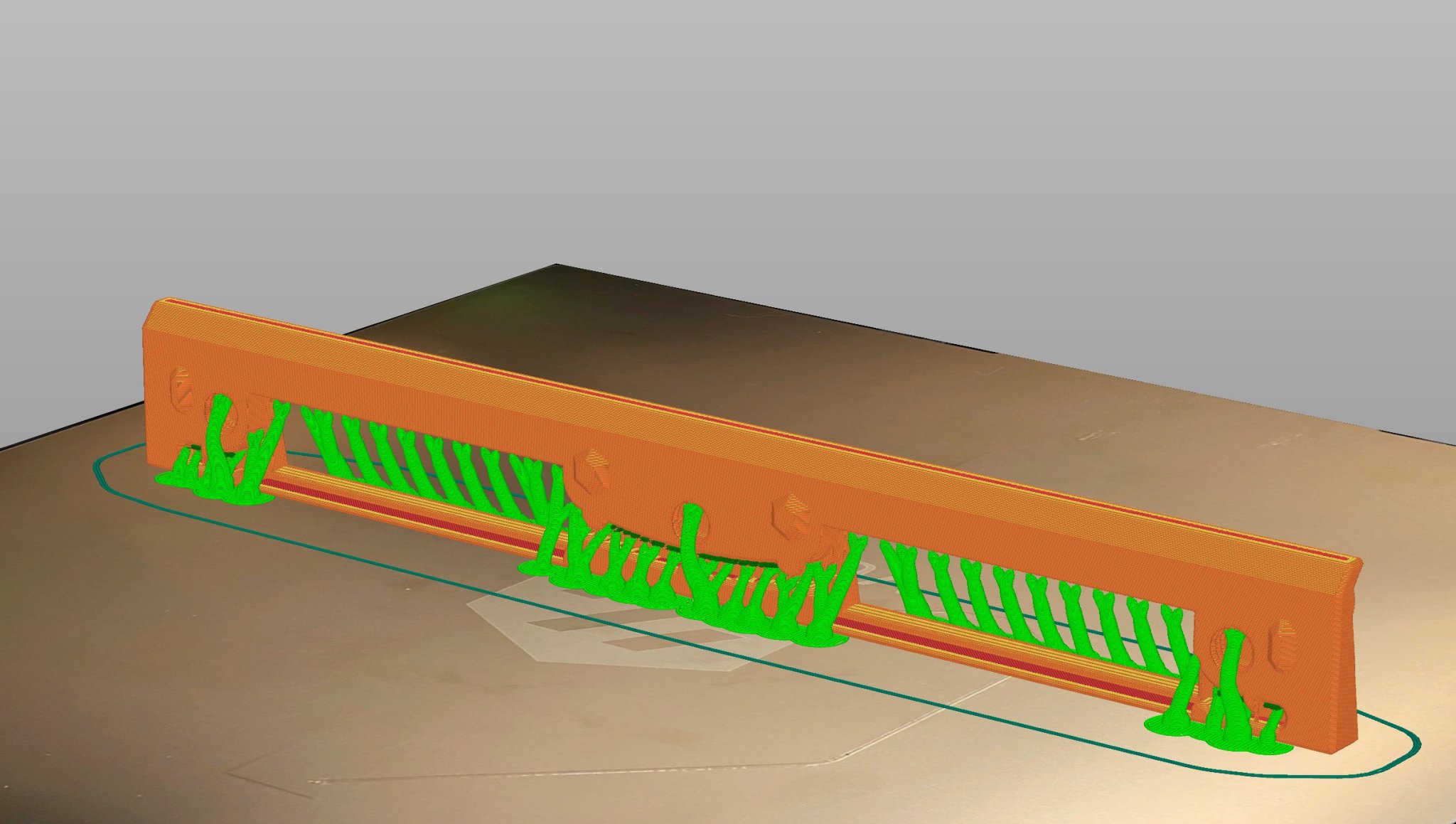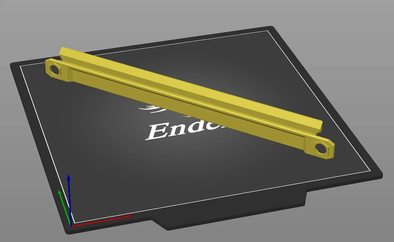 In các thanh trước và sau đứng theo chiều dọc. Brim có thể hữu ích để ngăn các đầu bị nâng lên. Thanh trước được thiết kế để in bằng 3 màu bằng cách thay đổi filament, và được in bằng cách sử dụng hỗ trợ hữu cơ. Thanh trước tùy chọn đi kèm không có lỗ ánh sáng không yêu cầu hỗ trợ. Thanh trước bao gồm các kênh dây, với các hỗ trợ tích hợp ở mỗi tab giữ dây của nó. Những cái này có thể được cắt đi, hoặc bạn có thể dẫn dây bên dưới mà không cần gỡ bỏ chúng. Các mô-đun ánh sáng được thiết kế để phù hợp với các đoạn ngắn của dải LED 10mm.