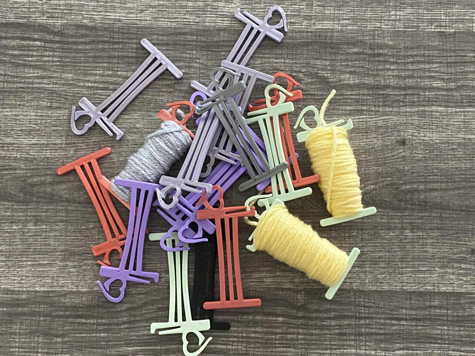Bobbin designed to hold a larger amount of varn for various projects. Includes a clip for attaching to the project