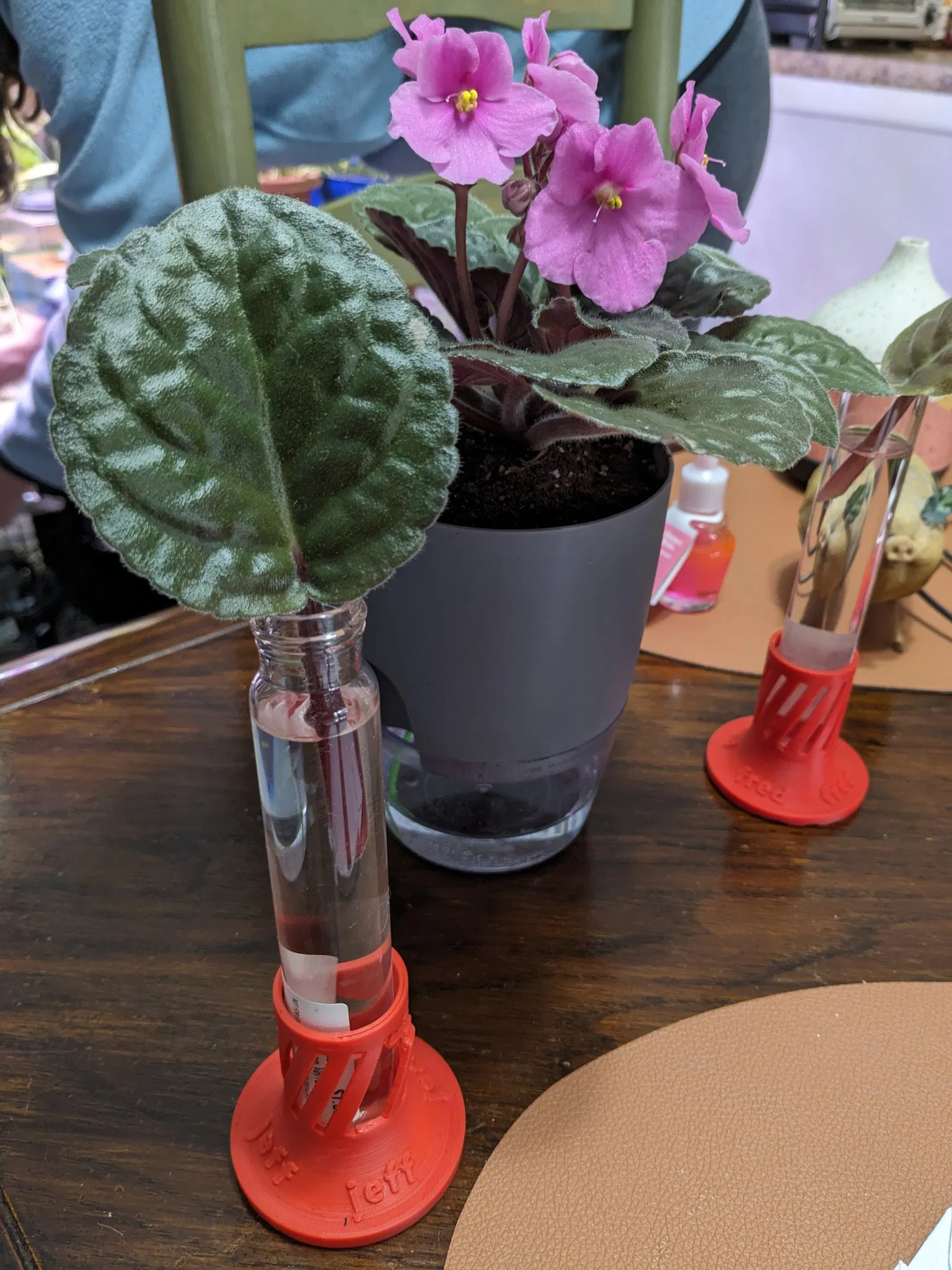 We trimmed back a couple of african violets and wanted to try growing a few of the clipped leaves in some 25mm diameter test tube thingies we had laying around. I threw this together to give them a way to stay up without leaning against other pots. Maybe not the most common need, but here you have it.
