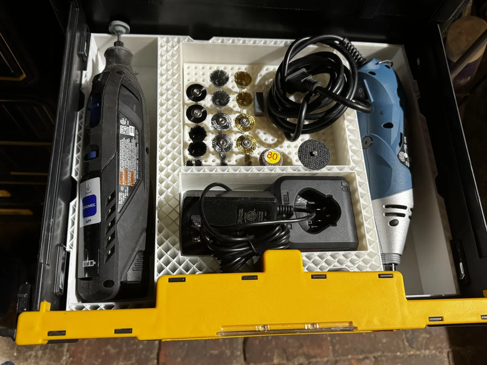 Cái này là cái khay đựng đồ Dremel của tui, để bỏ vô ngăn kéo sâu của dòng Versastack / T-stack. Mấy ông thông cảm nha, lúc in bị cúp điện giữa chừng nên tui chưa có in lại đó.