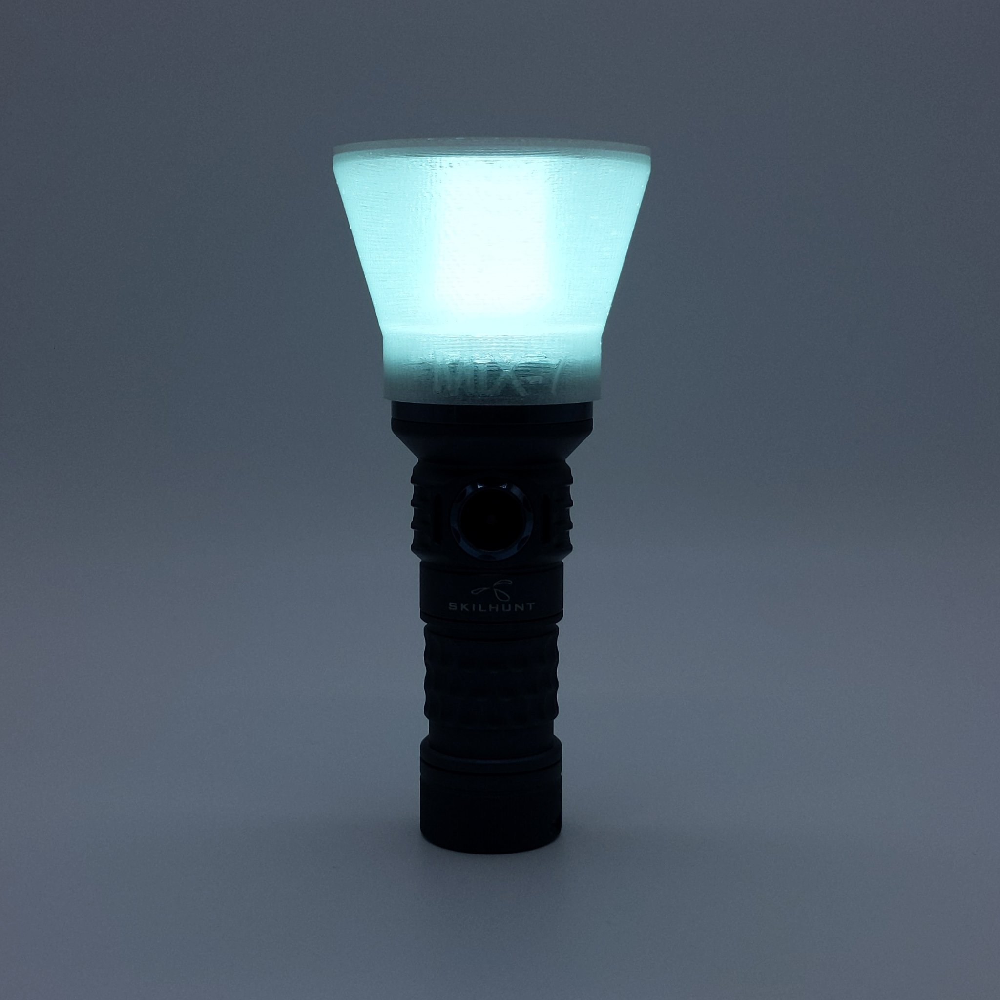 Đây là cái diffuser cho đèn pin, nó sẽ tỏa ánh sáng ra xung quanh và xuống dưới để tận dụng tối đa ánh sáng qua cái diffuser. Có yêu cầu một chút về việc lắp ráp, bạn cần dùng keo dạng thỏi, giấy bạc và dao. Tùy vào máy in 3D của bạn, có thể bạn cần scale (phóng to/thu nhỏ) lại mẫu một chút để cái nắp nó khớp vào thân một cách ổn định.