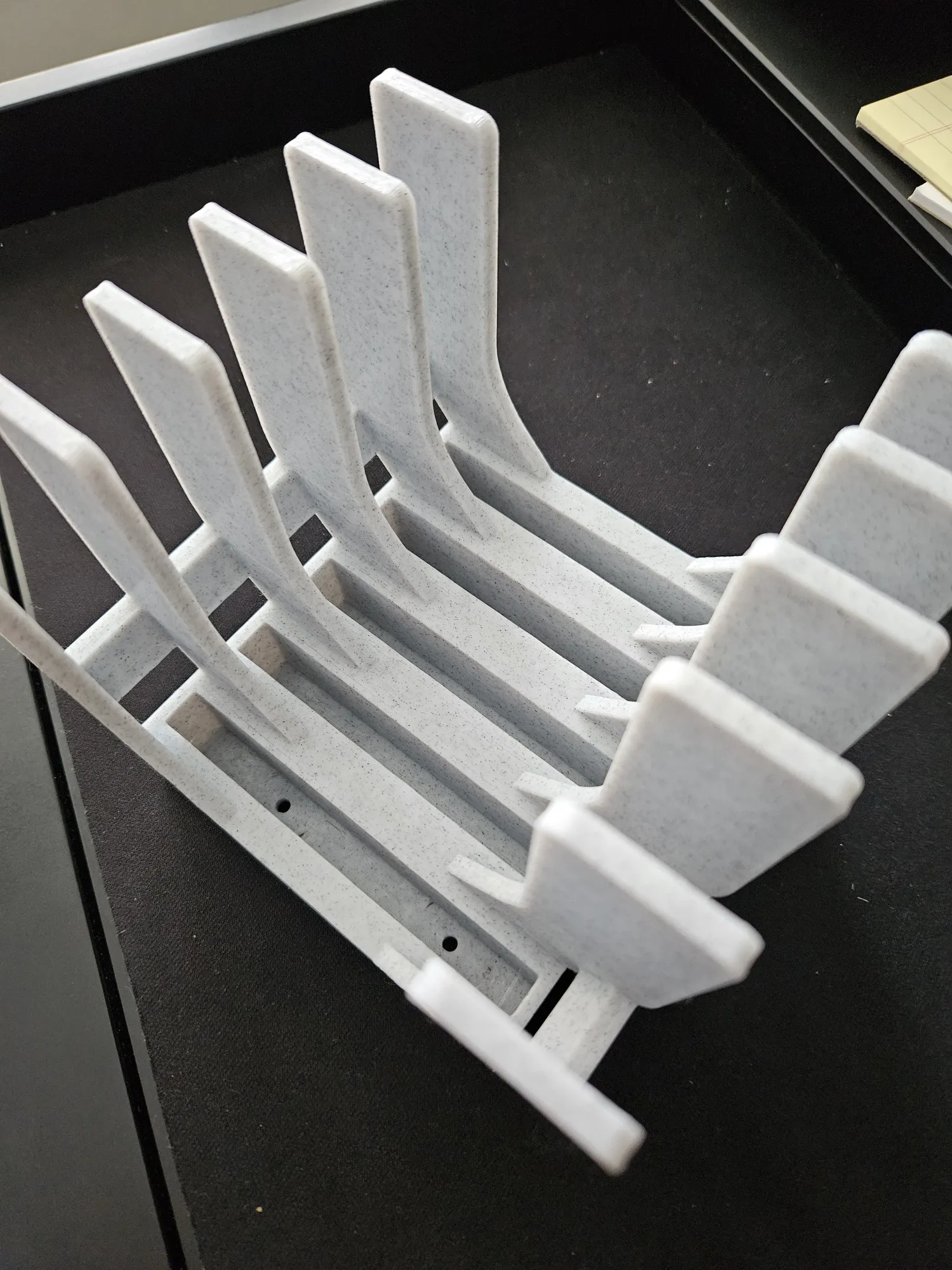 Made the slots wider to hold lids sideways and to accommodate bigger lids. Added holes to screw down to drawer