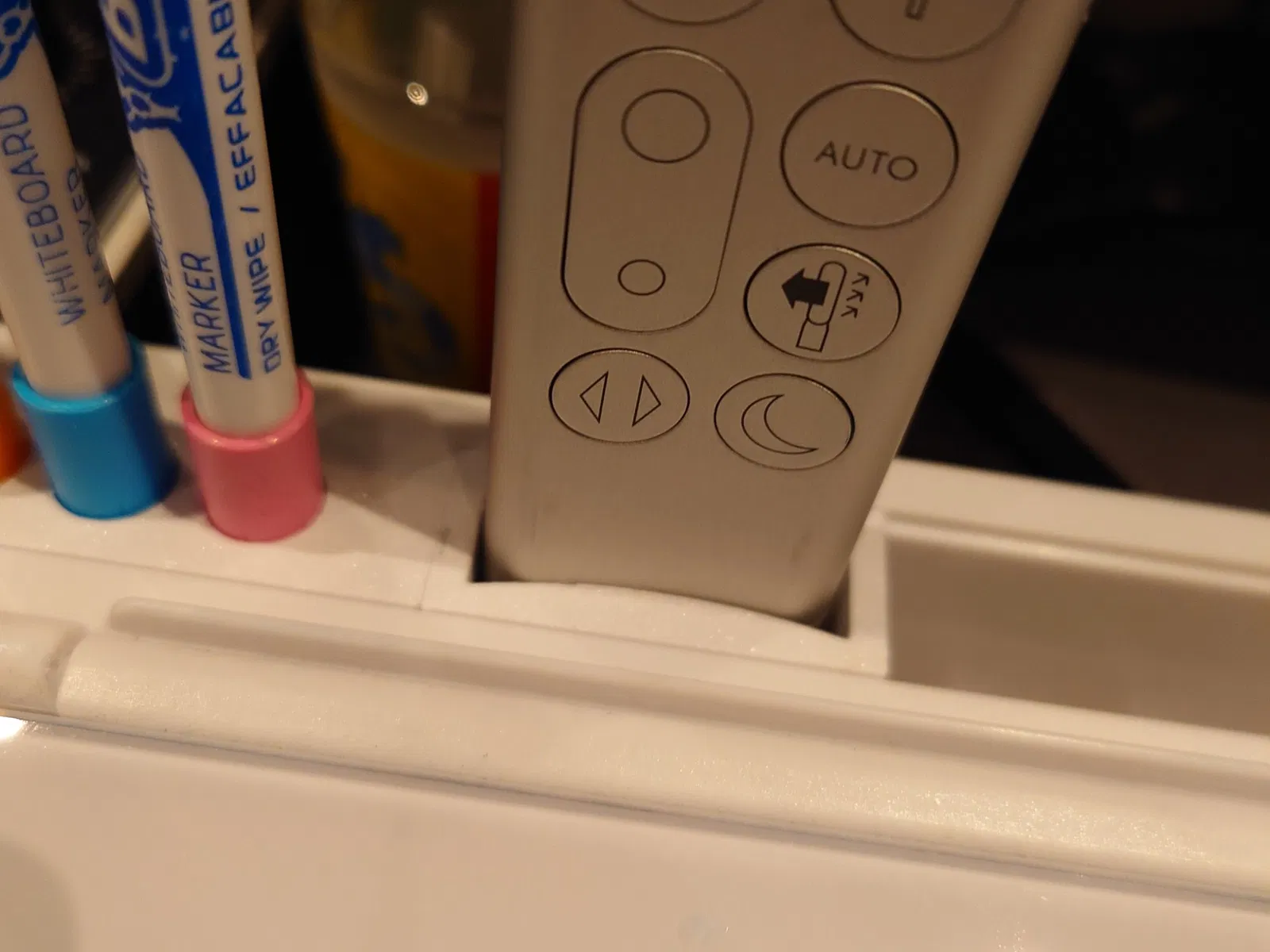 Cái "sabot" này giúp remote quạt Dyson đứng thẳng trong rãnh của bảng trắng Griply Desktop Whiteboard, giúp bạn dễ dàng bấm nút hơn. Thiết kế hình vuông để đặt vừa vặn bên cạnh chỗ cắm bút.