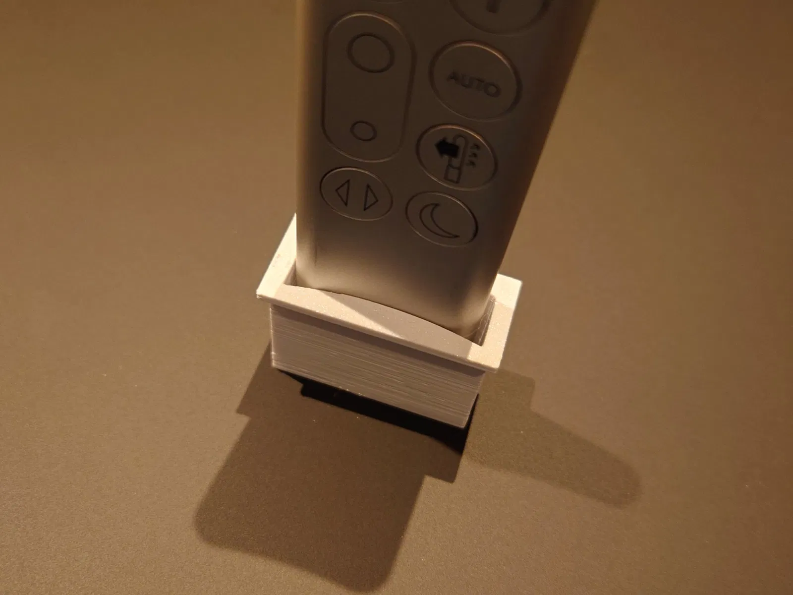 Bạn có thể để cái remote quạt Dyson vô cái rãnh đó, mà nó không có đứng thẳng lên được nên xài hơi khó khi để ở đó. Cái "sabot" này sẽ giúp cái remote đứng thẳng lên, để bạn bấm nút mà không cần di chuyển nó.