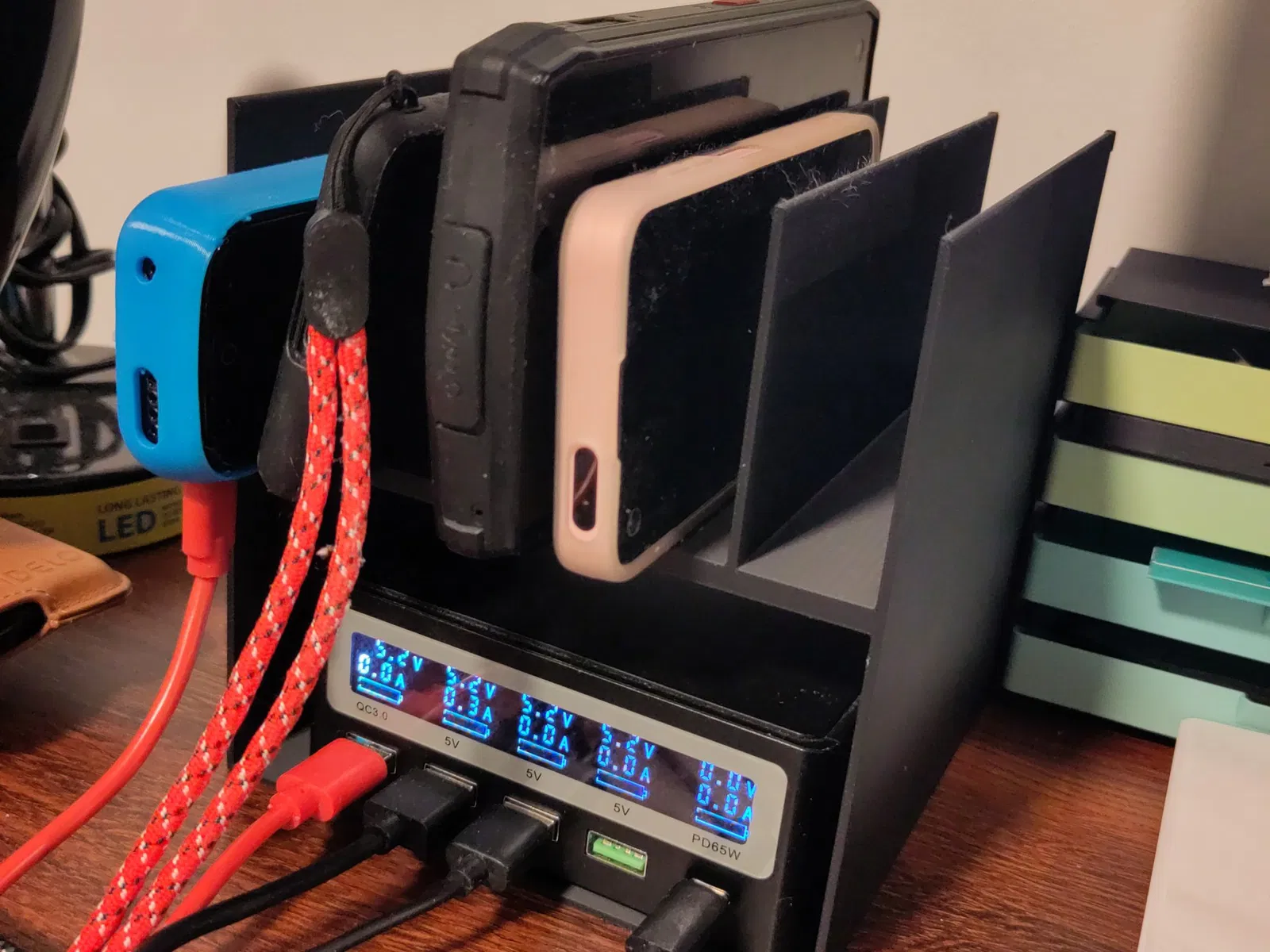 Trạm sạc điện thoại kiêm giá đỡ đơn giản, dễ dàng tùy chỉnh. Thiết kế có khe cắm sạc mặc định cho PinePower, có thể tùy chỉnh kích thước và số khe cắm qua OpenSCAD.