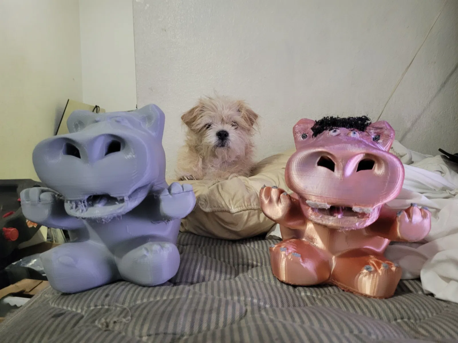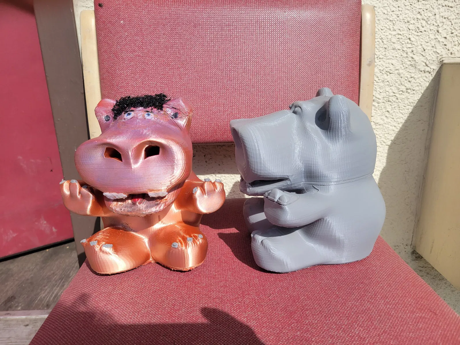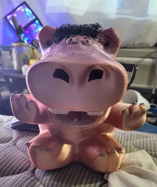 Chỉ cần in thẳng đứng với đế phẳng trên bàn in. Bạn có thể in mô hình hà mã chính bằng bất kỳ vật liệu nào bạn thích (tôi đã dùng PLA cho những cái trong ảnh của mình). Phần nắp nên được in bằng TPU. Tôi dùng bút in 3D để thêm các chi tiết hoàn thiện, như trong ảnh (tóc, mắt, v.v.), hoặc bạn có thể sơn để có hiệu quả tốt. Tôi đã thêm một số thanh chống tích hợp cho hai răng cửa, vì vậy bạn có thể in mà không cần thanh chống, cũng không cần raft. Tôi khuyên dùng 10% infill cho hà mã và 20% cho nắp.