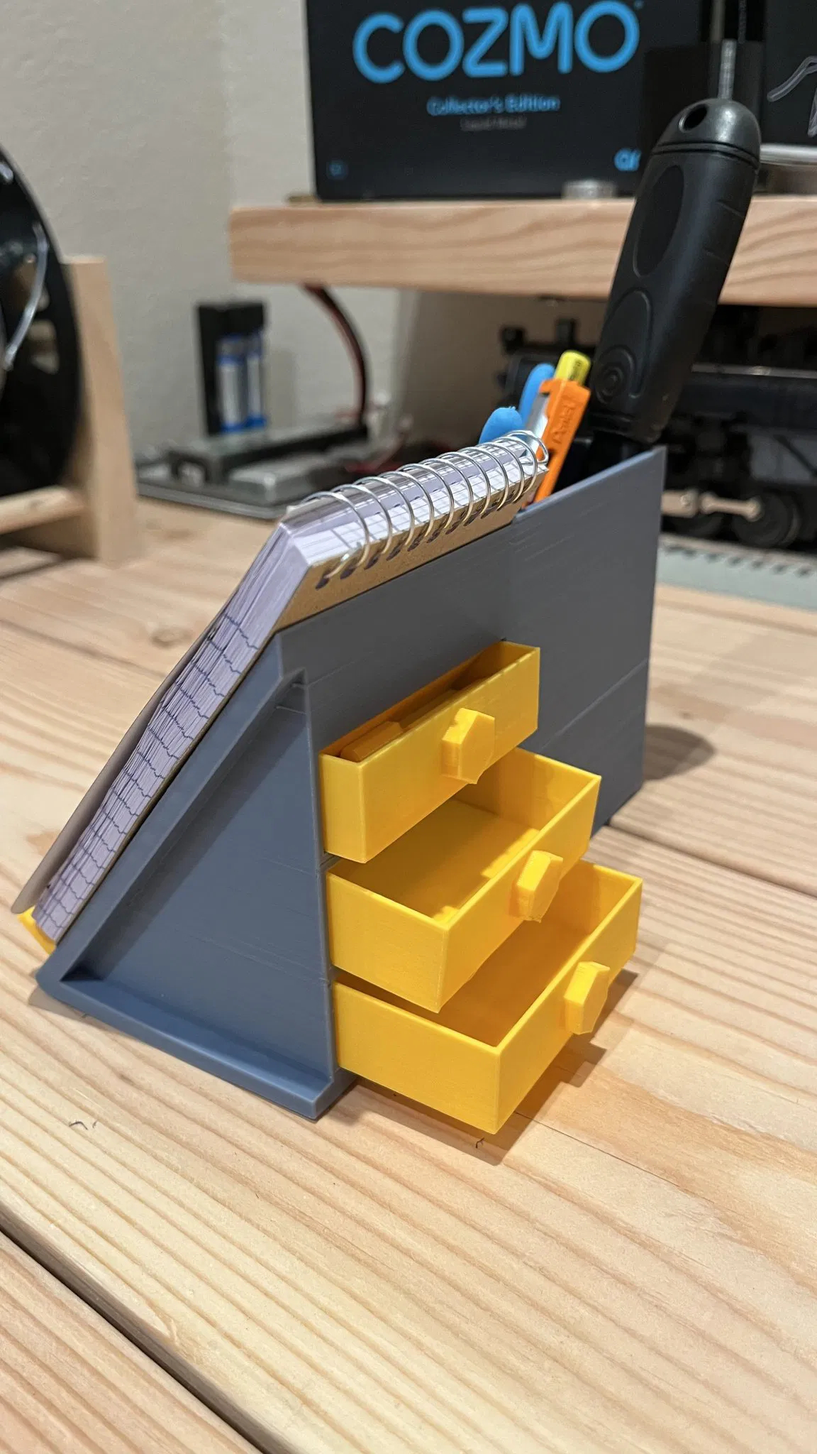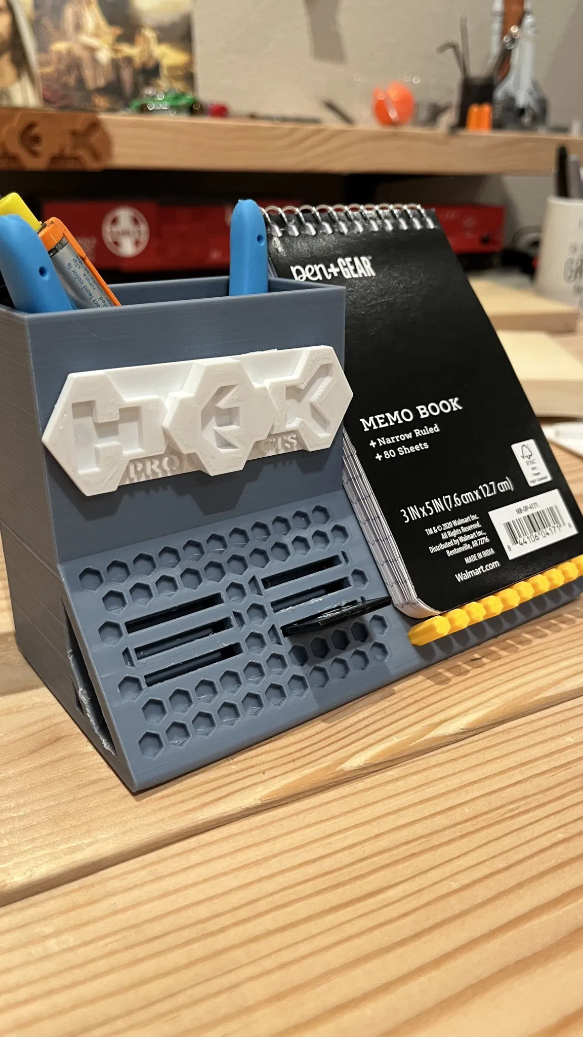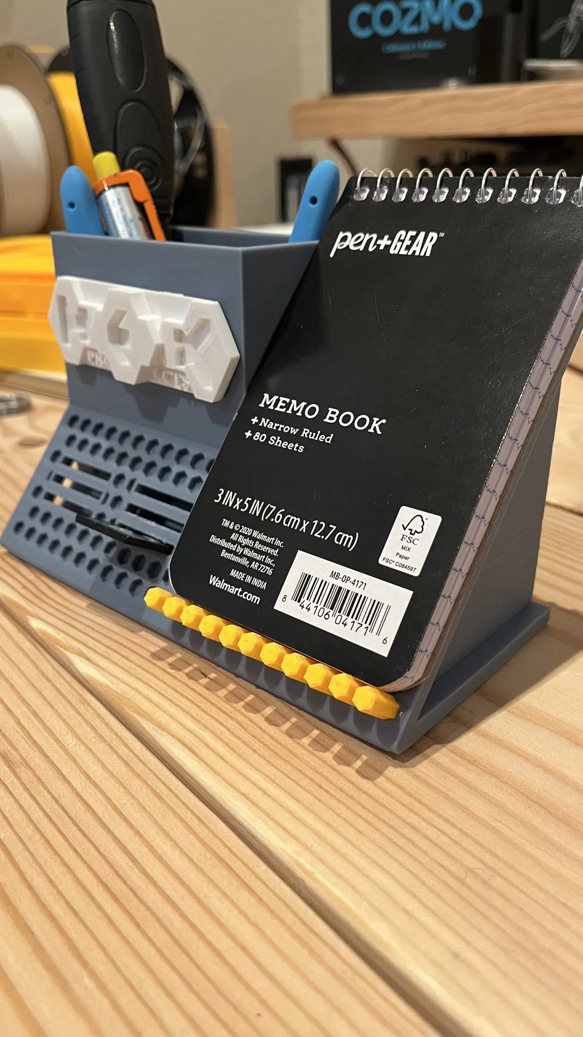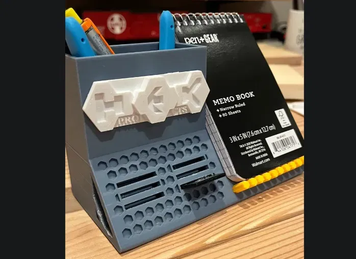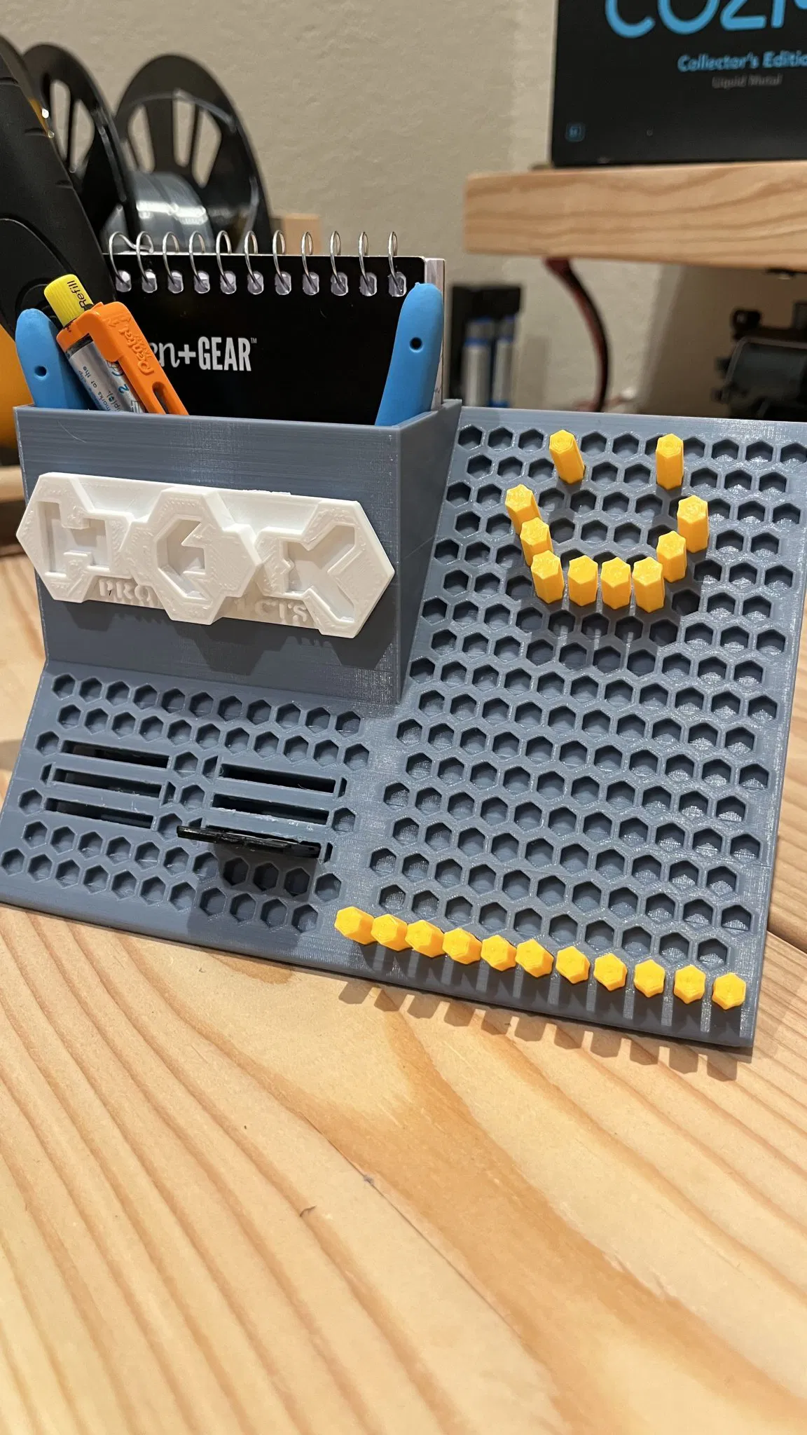 Thiết kế này bao gồm một nơi để giữ bút chì và bút bi của bạn, thẻ SD và nhiều thứ khác! Chỉ cần di chuyển các Hex Studs xung quanh giao diện kiểu tổ ong để làm cho bộ tổ chức này phù hợp với mọi nhu cầu của bạn! Các ngăn kéo ở phía sau tạo thêm không gian để lưu trữ các ⬣Hex Studs⬣ dư cũng như các vật dụng văn phòng hữu ích khác. Cũng có các lỗ để gắn logo hoặc tên cá nhân của bạn để thực sự biến bộ tổ chức bàn này thành của bạn!