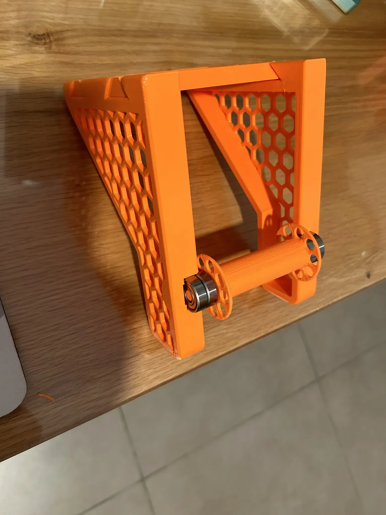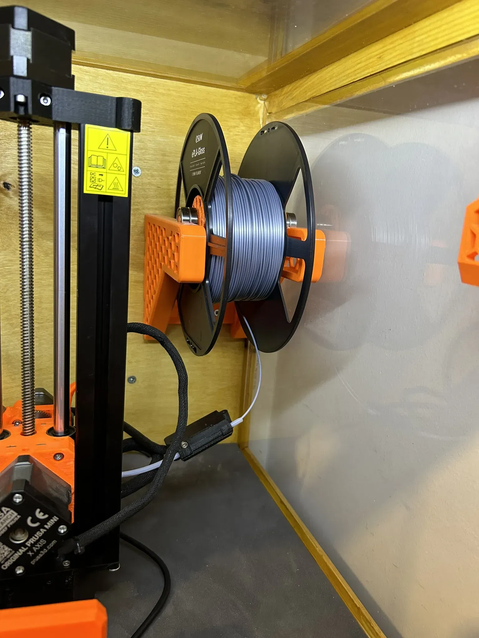Cái giá đỡ cuộn dây tóc này được gắn chắc chắn lên tường, giúp cuộn dây tóc quay trơn tru với sự trợ giúp của vòng bi và giải phóng không gian gần máy in.