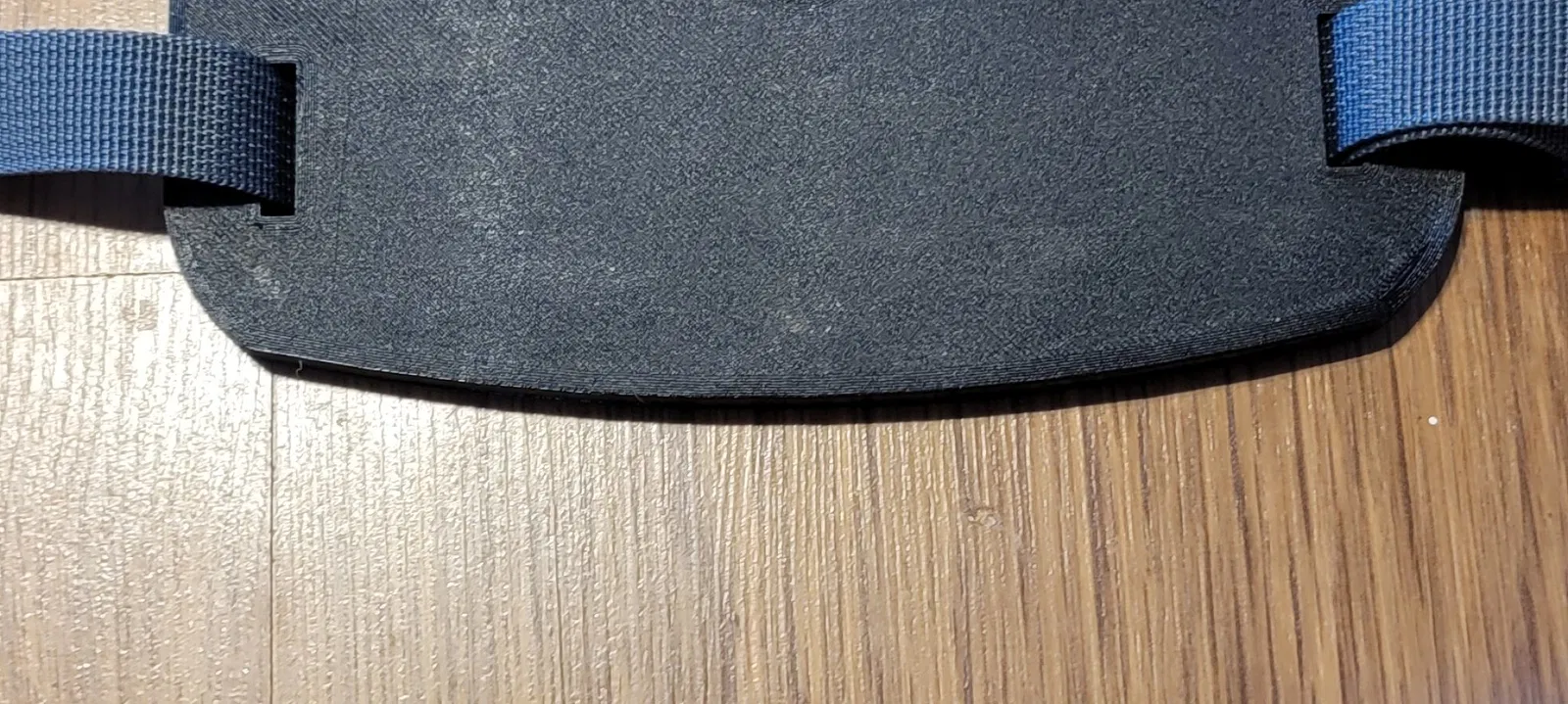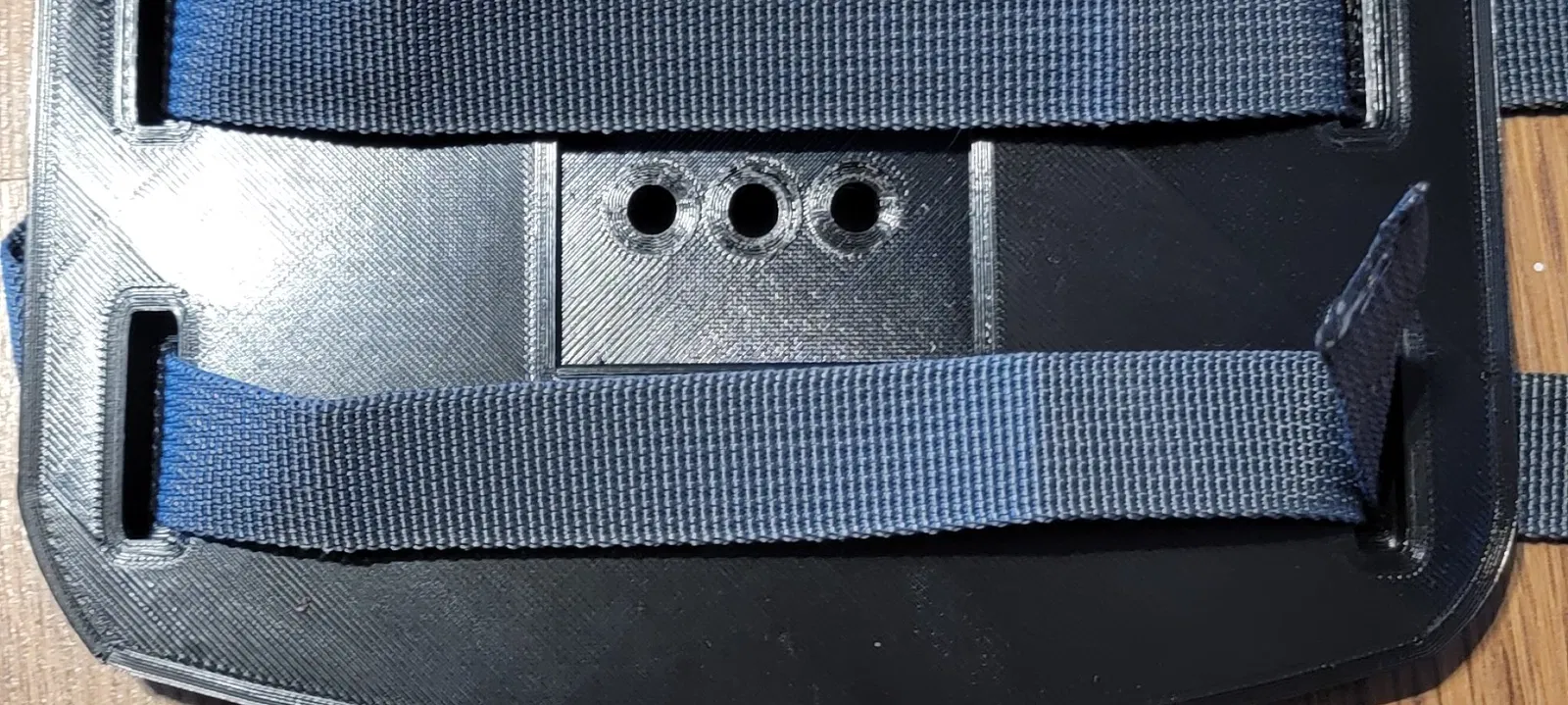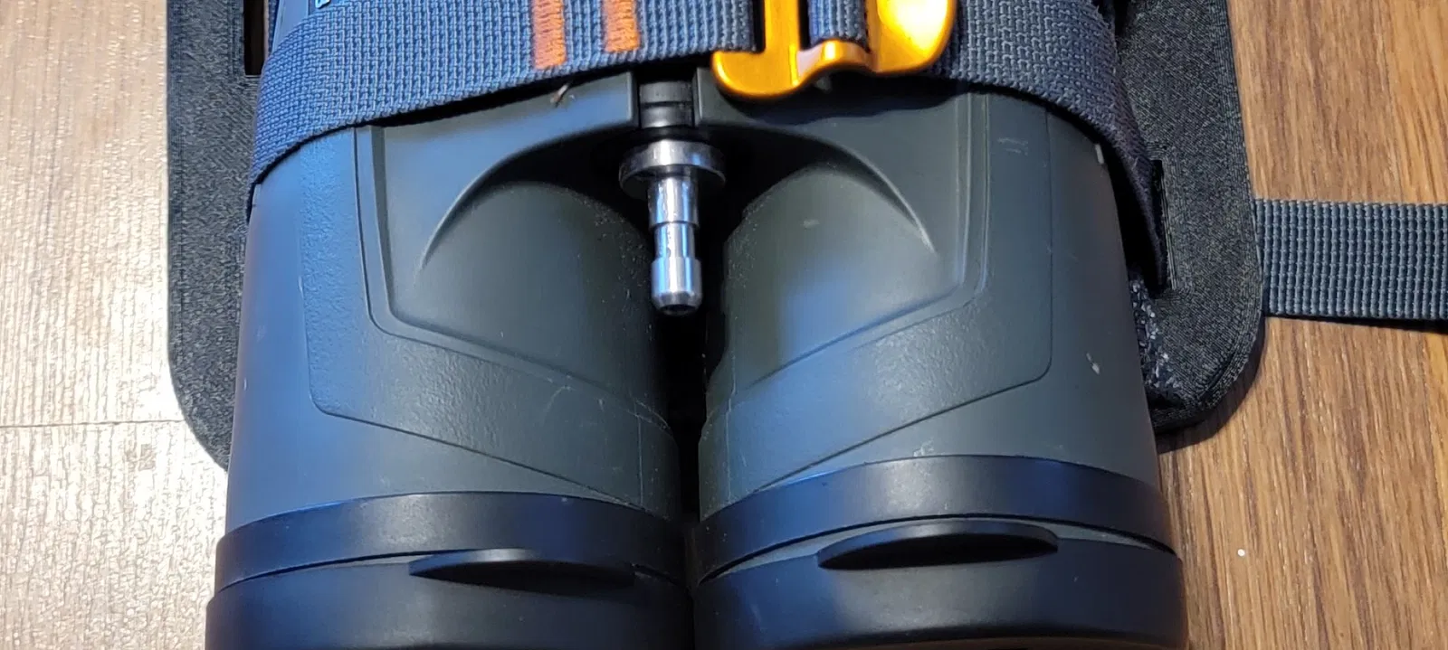 Bino plate with recess for Acra mount plate at bottom. Integrated slots for straps to hold binos down. Printed with PLA and 6 walls 25% infill, very rigid. Insure that you print the plate upside down that the recess is on top.