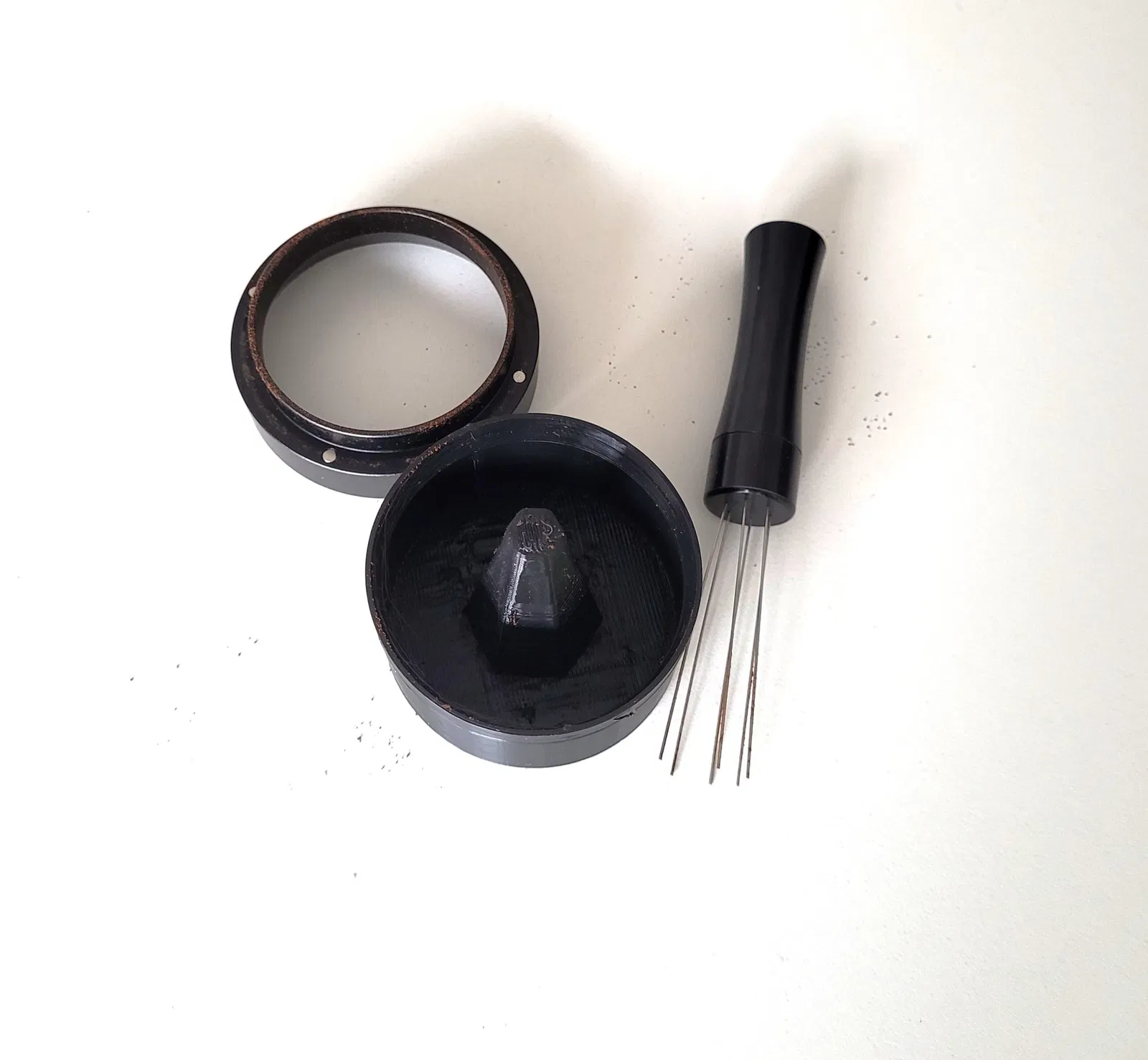 Nếu bạn có một cái phễu định lượng (dosing funnel) và một dụng cụ WDT, thì cái đế giữ tiết kiệm không gian này là dành cho bạn đó nha.
