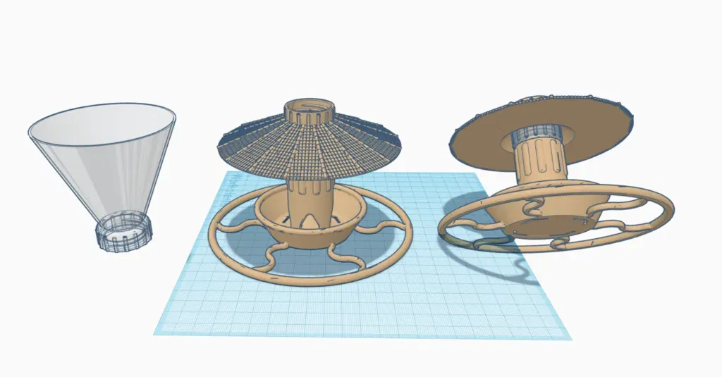 Tôi muốn có một máng ăn chim từ chai nước ngọt đơn giản mà phong cách. Tôi đã tìm thấy một mẫu gần như hoàn hảo (https://www.thingiverse.com/thing:1710755) và làm cho phần thoát nước lớn hơn một chút. Tôi tìm thấy phần mái che đáng yêu (https://www.thingiverse.com/thing:3816181) và một số phần ren chai nước ngọt, sau đó tùy chỉnh mọi thứ trong Tinkercad.