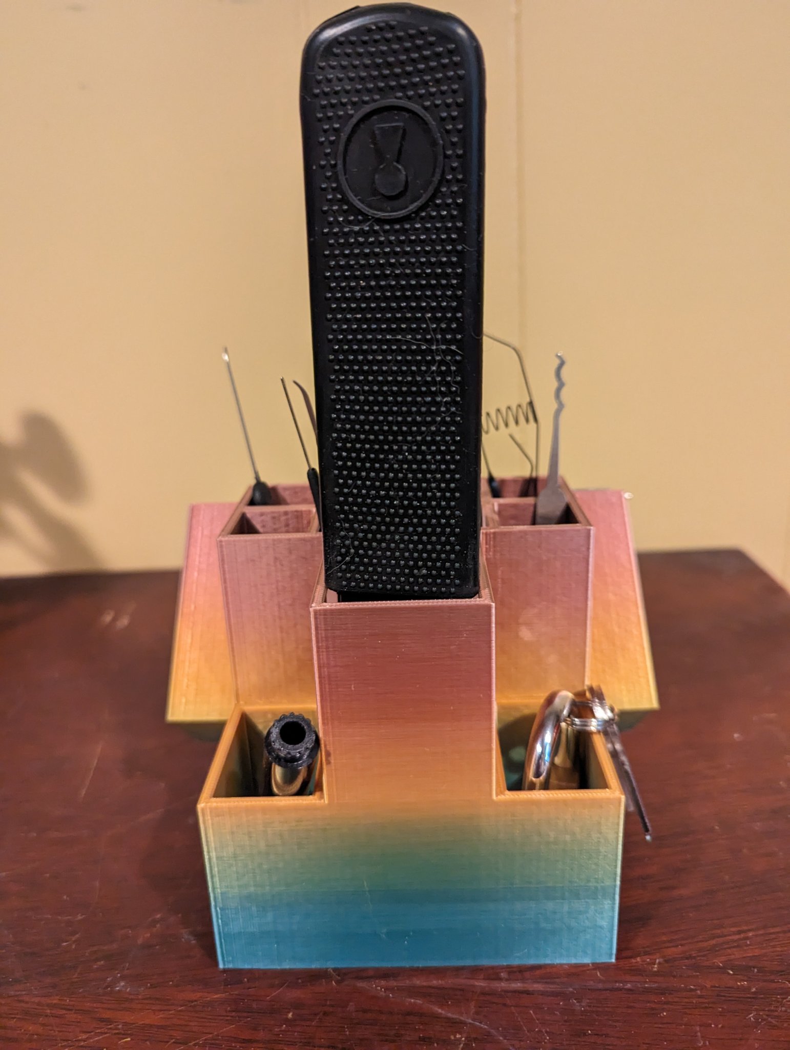 Tôi thiết kế cái này để tổ chức và lưu trữ các dụng cụ mở khóa của mình, thanh căng, nhíp ghim, v.v.. Tôi đã bao gồm một thùng lớn ở phía sau để chứa búa khóa đột. Phiên bản đầu tiên của tôi có các chốt để giữ móc chìa khóa, nhưng tôi muốn có một chút tổ chức hơn cho các thanh căng của mình.