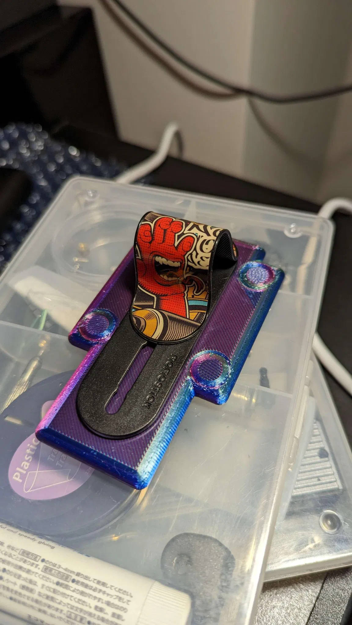 Dùng với các ốp lưng Peak Design mobile. Bạn có thể chỉnh sửa lại hoặc gắn một cái giữ ngón tay như trong hình. Dùng nam châm tròn đường kính 10mm, cao tối đa 3mm. Đặt nó hơi nghiêng và miếng ở giữa sẽ xoay khi gắn nam châm vào ốp lưng, giúp bám vào ốp lưng tốt hơn là chỉ có nam châm.