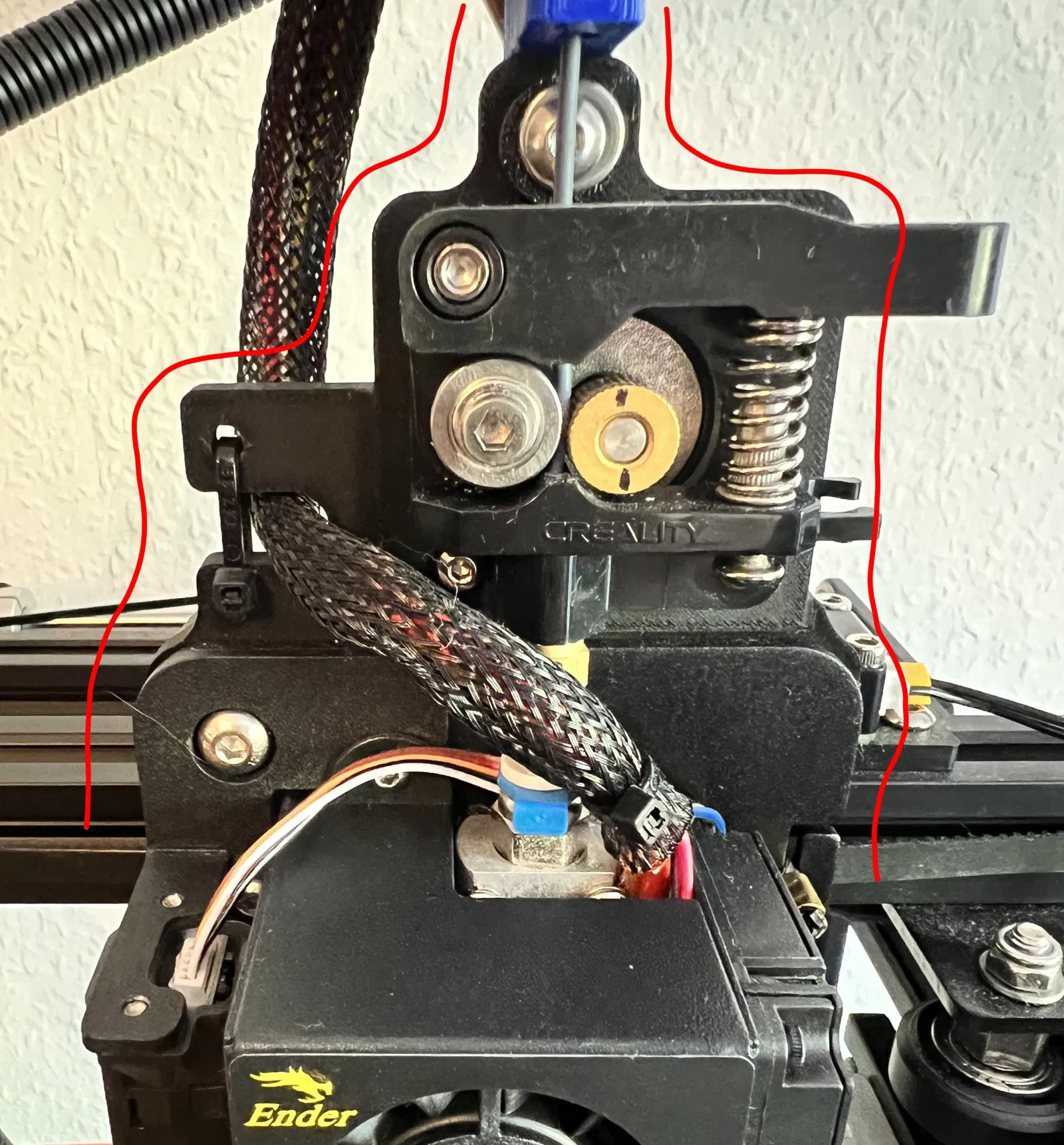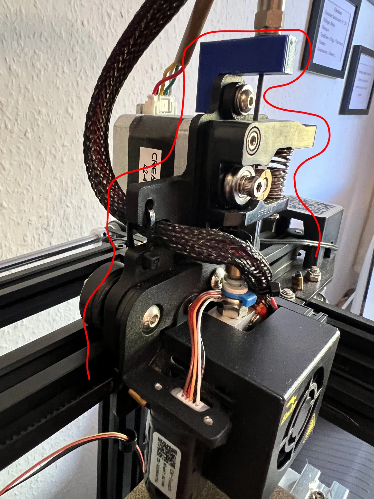 Một cần gạt filament giúp ống PTFE (Bowden) được dẫn sạch từ trên xuống bộ đùn. Nơi bộ đùn từng được gắn trước đây, giờ là một ống dẫn đơn giản giữ đầu kia của ống PTFE. Điều này cho phép mọi thứ được tháo lắp lại trạng thái ban đầu trong vài phút.