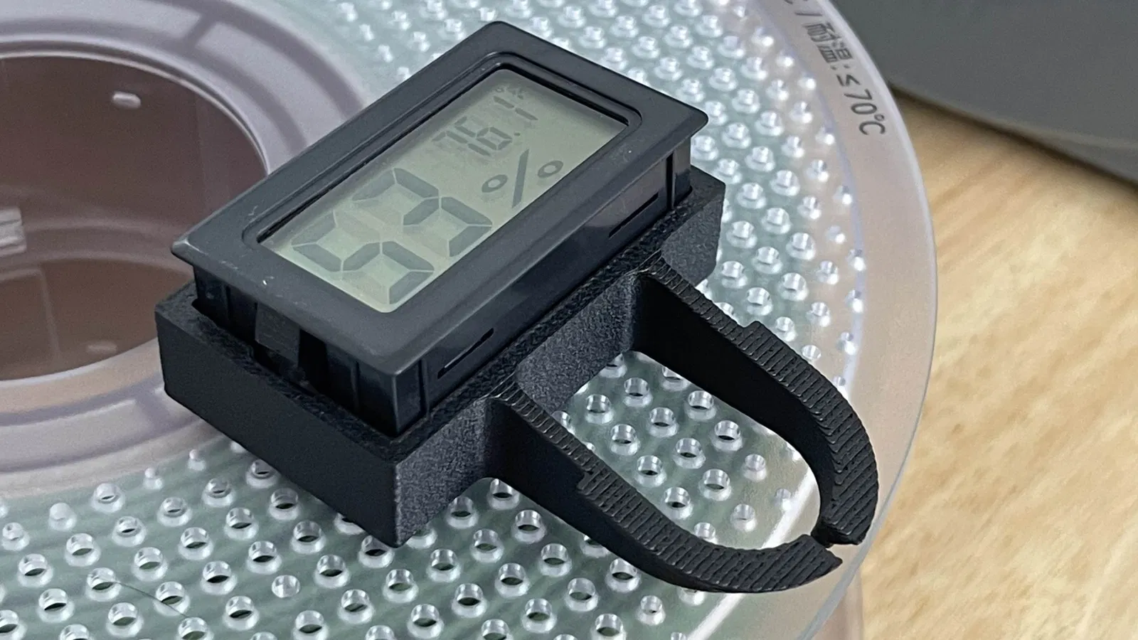 Cập nhật 2022-09-16: Sau một thời gian sử dụng đồng hồ đo độ ẩm ở nhiệt độ tối đa của SunluS1 (mà tôi cũng dùng để sấy túi silica - hiệu quả năng lượng hơn nhiều so với trong lò nướng), tôi nhận ra rằng ở nhiệt độ cao, ngay cả PETG gắn trực tiếp vào bộ phận gia nhiệt kim loại cũng hơi mềm ra. Giá đỡ vẫn hoạt động tốt, nhưng tấm phía trước bị cong một chút ở phía dưới và không còn đứng thẳng hoàn hảo nữa.