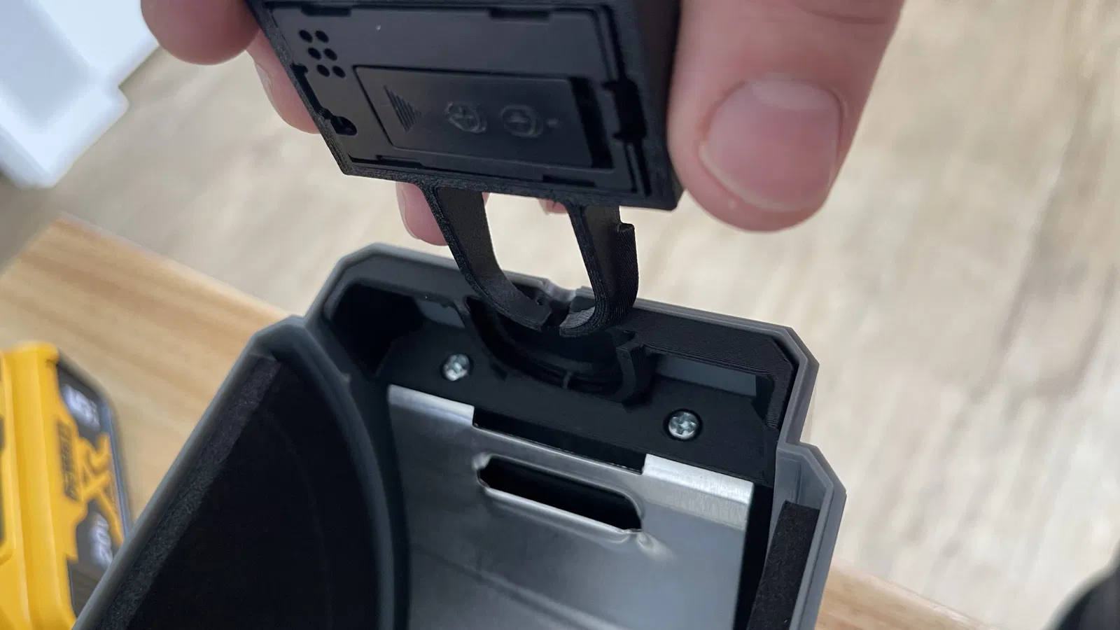 Vì vậy, tôi đã tạo ra các thiết kế của riêng mình được gắn vào bên trong đế và chỉ để lại lỗ mở và không chạm vào. Giờ đây, nó bao gồm hai phần, một tấm đế gắn vào mặt trước bên trong của máy sấy và một giá đỡ cho đồng hồ đo độ ẩm, có thể dễ dàng lắp hoặc tháo ra ngay cả khi dây tóc đã được nạp và đang in. Kết quả là ổn định, không bị rung lắc, cũng không dễ bị gãy.