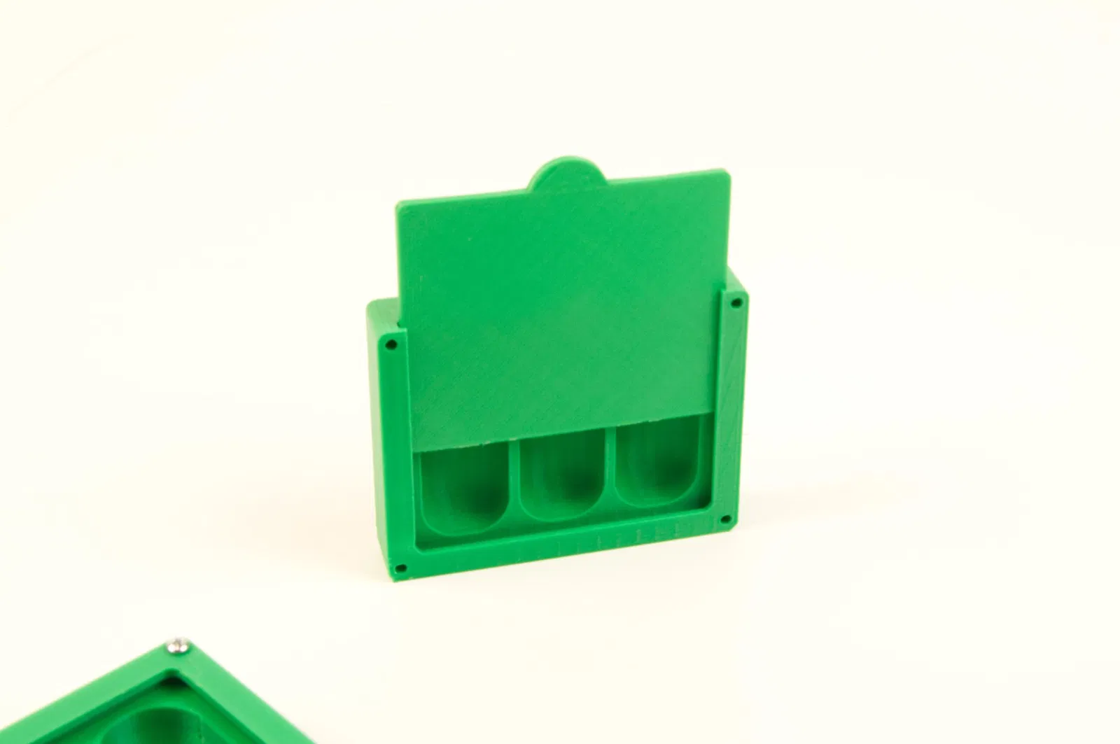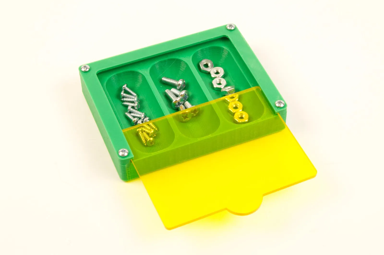 Đây là một khay chứa các bộ phận nhỏ với nắp trượt. Có ba phần, khay (hoặc “đáy”), phần trên và nắp. Khay có thể được sử dụng hoàn toàn độc lập, nhưng bạn cũng có thể in phần trên và thêm nắp trượt để bạn có thể đóng lại và ngăn các bộ phận nhỏ bay khắp phòng khi bạn làm rơi nó khỏi bàn.