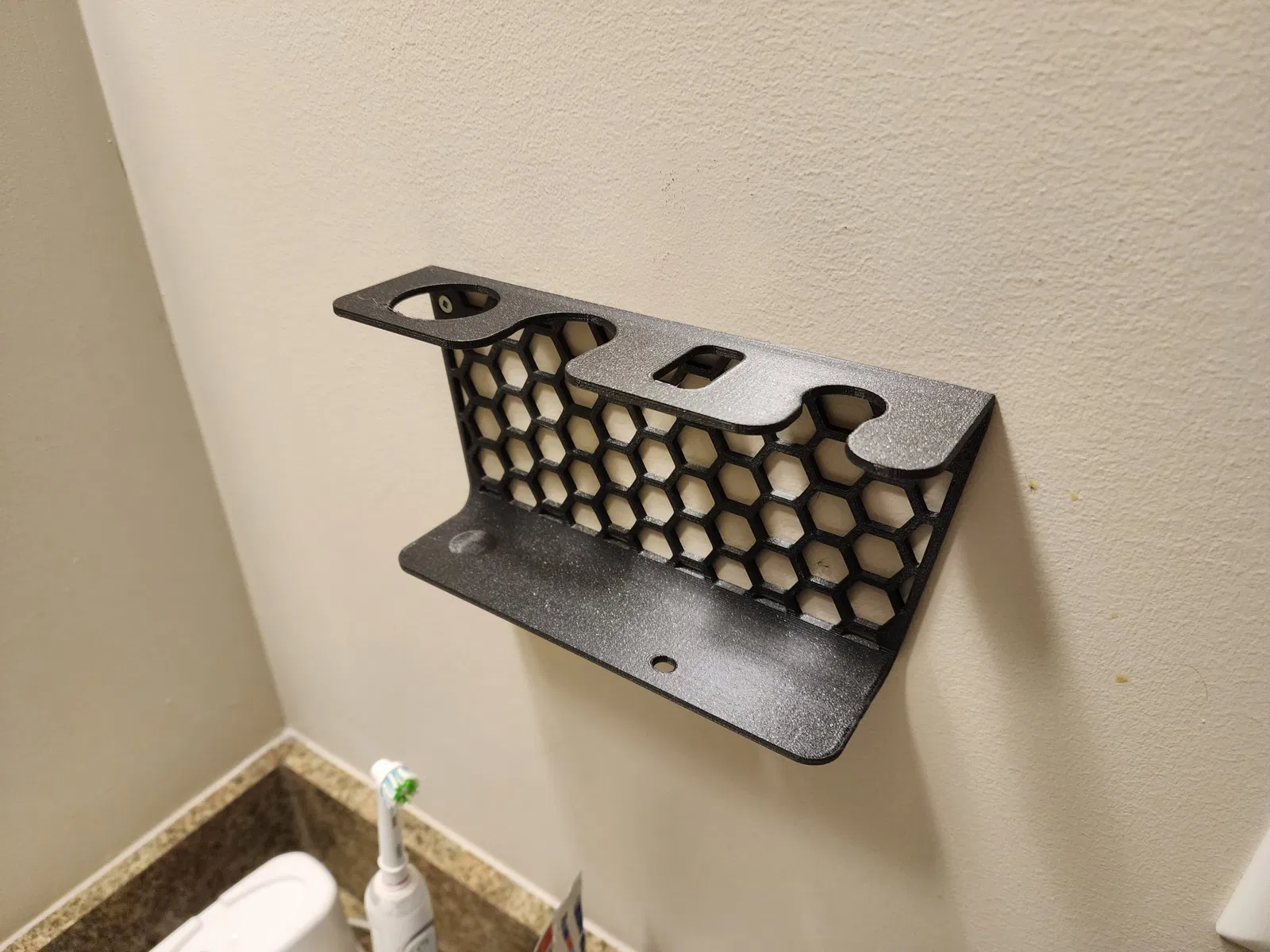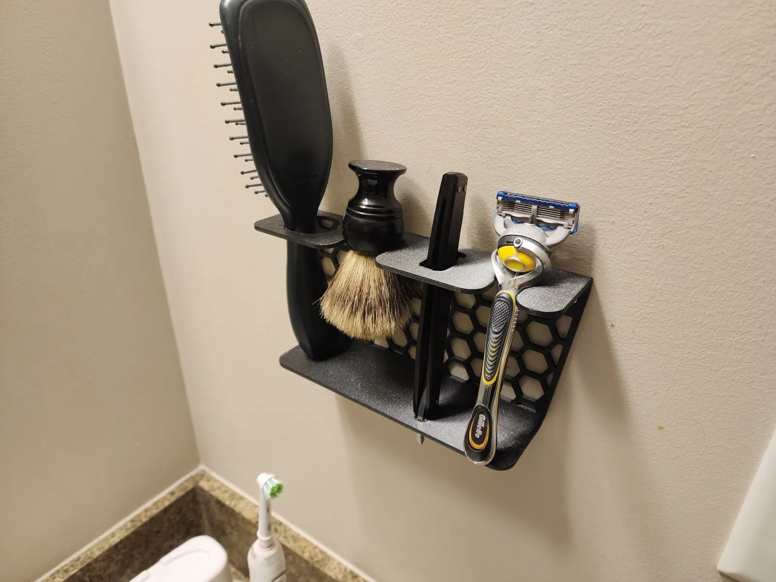 Một cái kệ phòng tắm nhỏ để đựng đồ cạo râu. Sản phẩm này được thiết kế để trưng bày các vật dụng cạo râu của bạn một cách gọn gàng và thẩm mỹ, thay vì để chúng trong tủ.