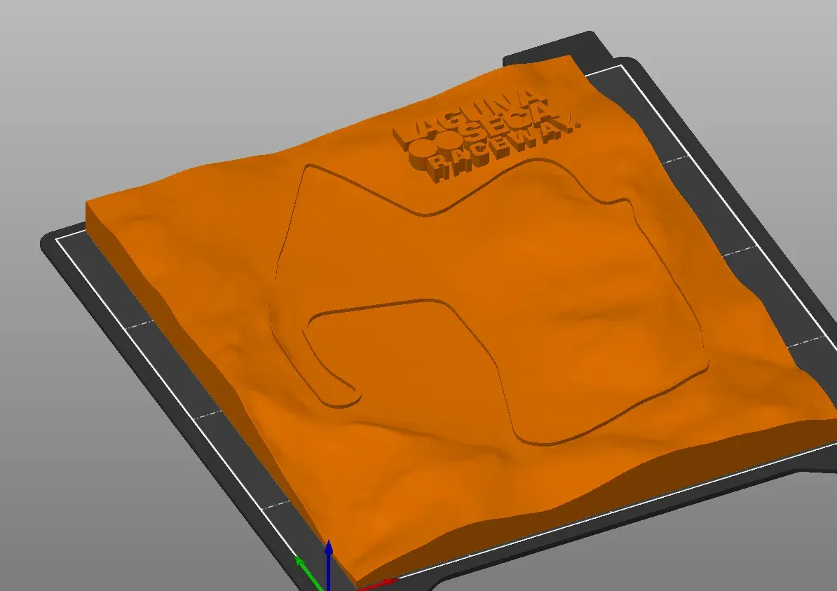 Mô hình địa hình trường đua Laguna Seca, nổi bật với những thay đổi độ cao, đặc biệt là khúc "corkscrew" nổi tiếng. Được tạo từ dữ liệu địa hình và thêm bản đồ đường đua, logo.