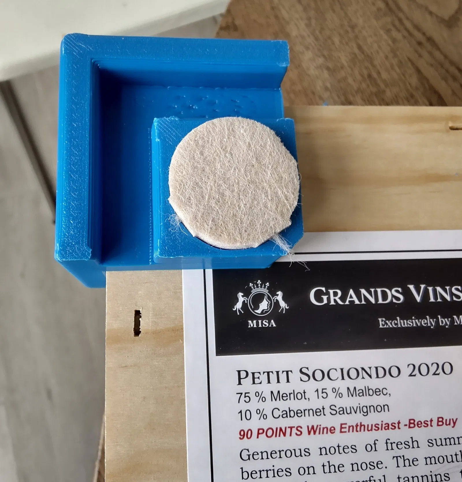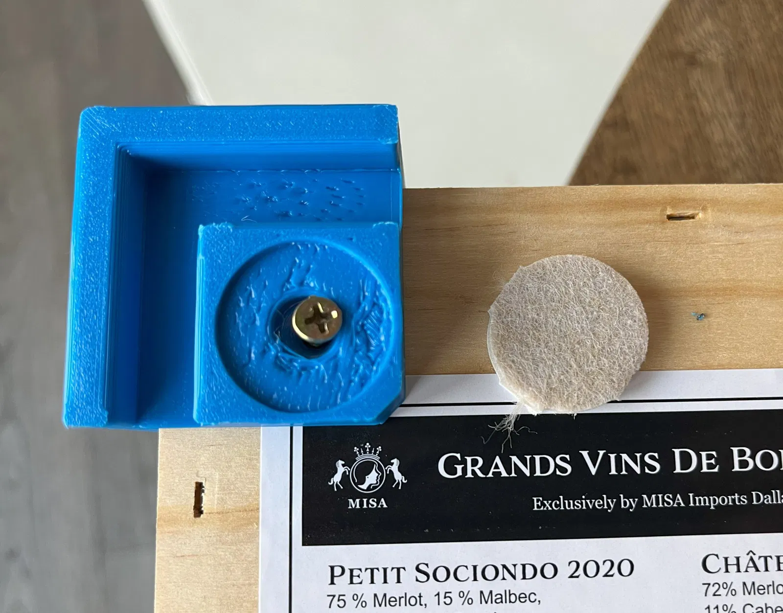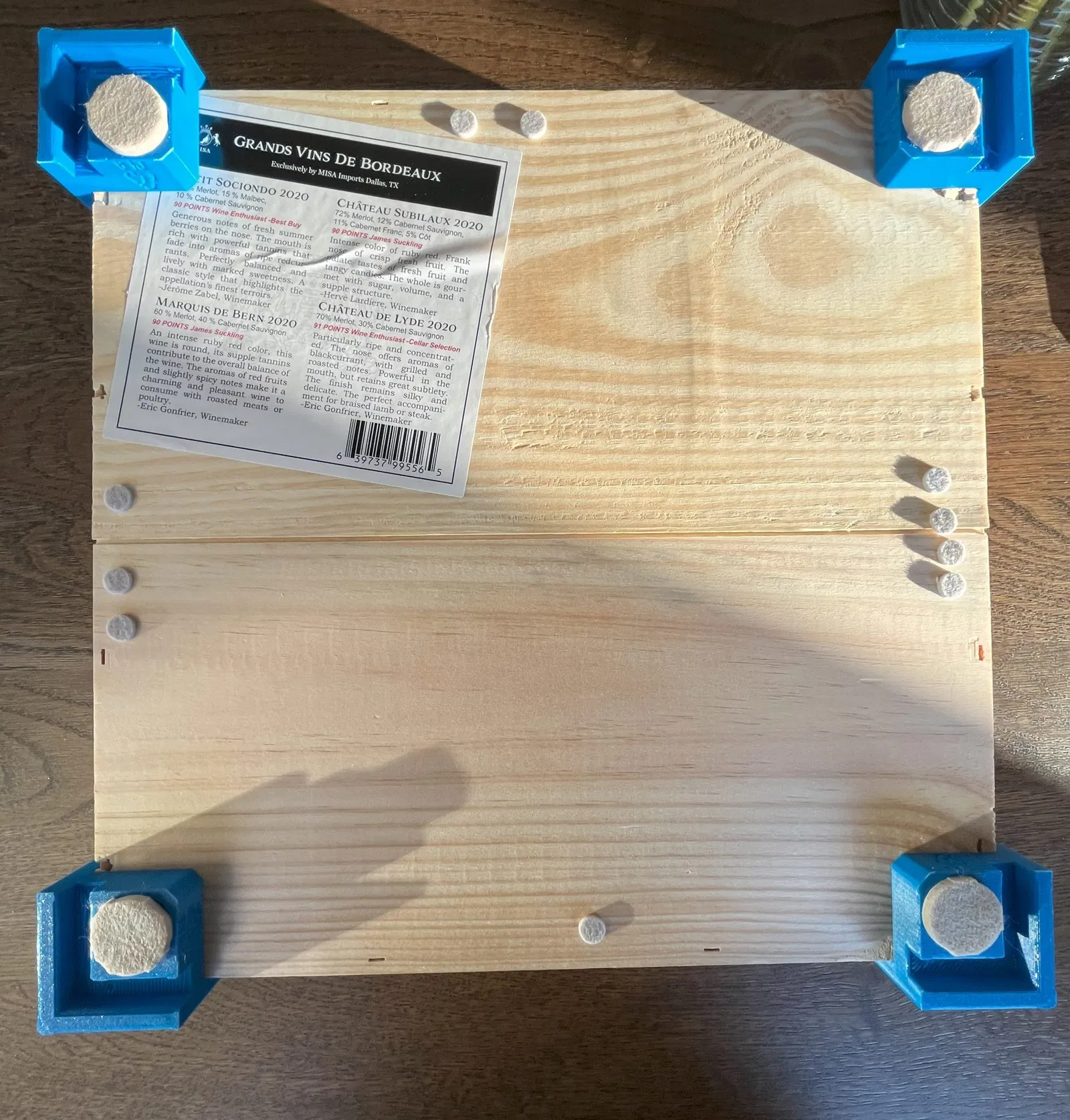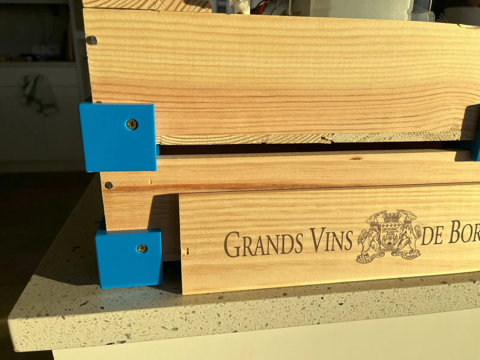 Kết hợp tình yêu rượu vang của bạn với niềm đam mê in 3D - tái sử dụng hộp gỗ. Bộ góc xếp chồng cho phép đặt các hộp rượu Costco lên nhau một cách chắc chắn, có miếng đệm nỉ bảo vệ và cố định bằng ốc vít gỗ.