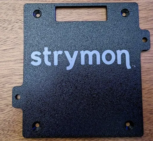 Model comes with the Strymon logo visible on the bottom of the pedal so it's easy to tell what pedal this adapter plate fits. I followed Strymon's Brand Assets Use Guide available here. The logo is setup to print in a second color, if desired.