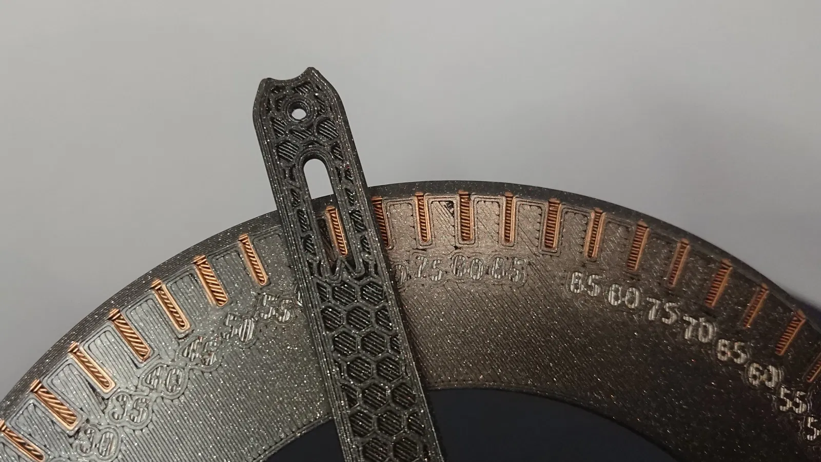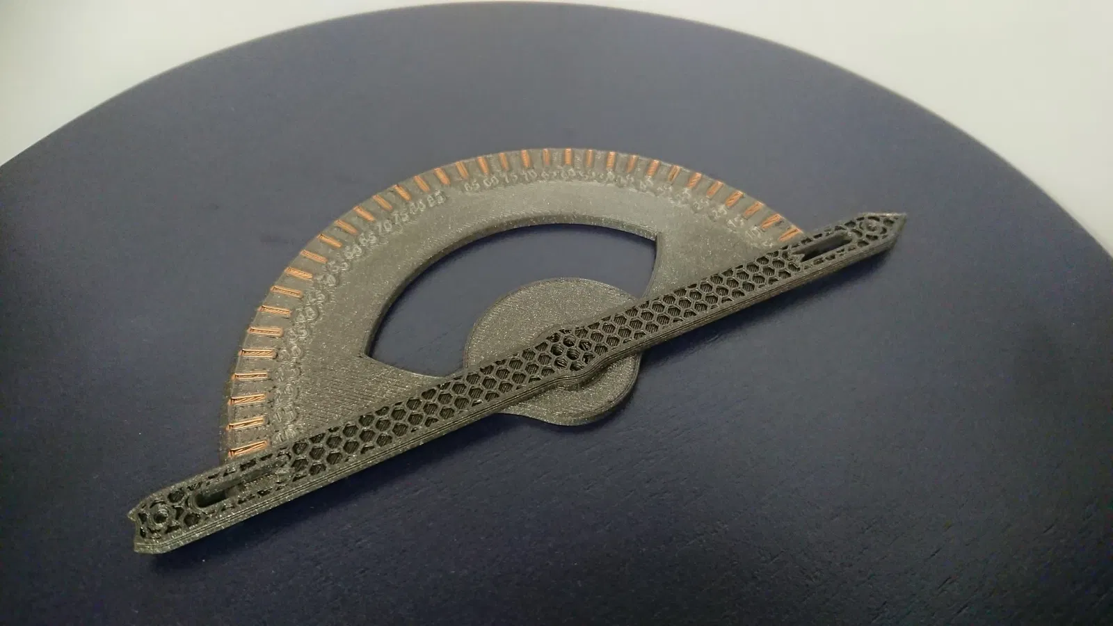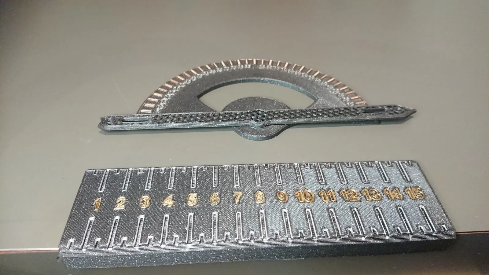 Thước đo độ này có núm xoay với các ô cửa sổ để canh góc chính xác và khe để đánh dấu. Phiên bản 2 chỉ thay đổi kích thước số và khoảng cách, hiển thị số mỗi 10 độ bắt đầu từ 5 độ.