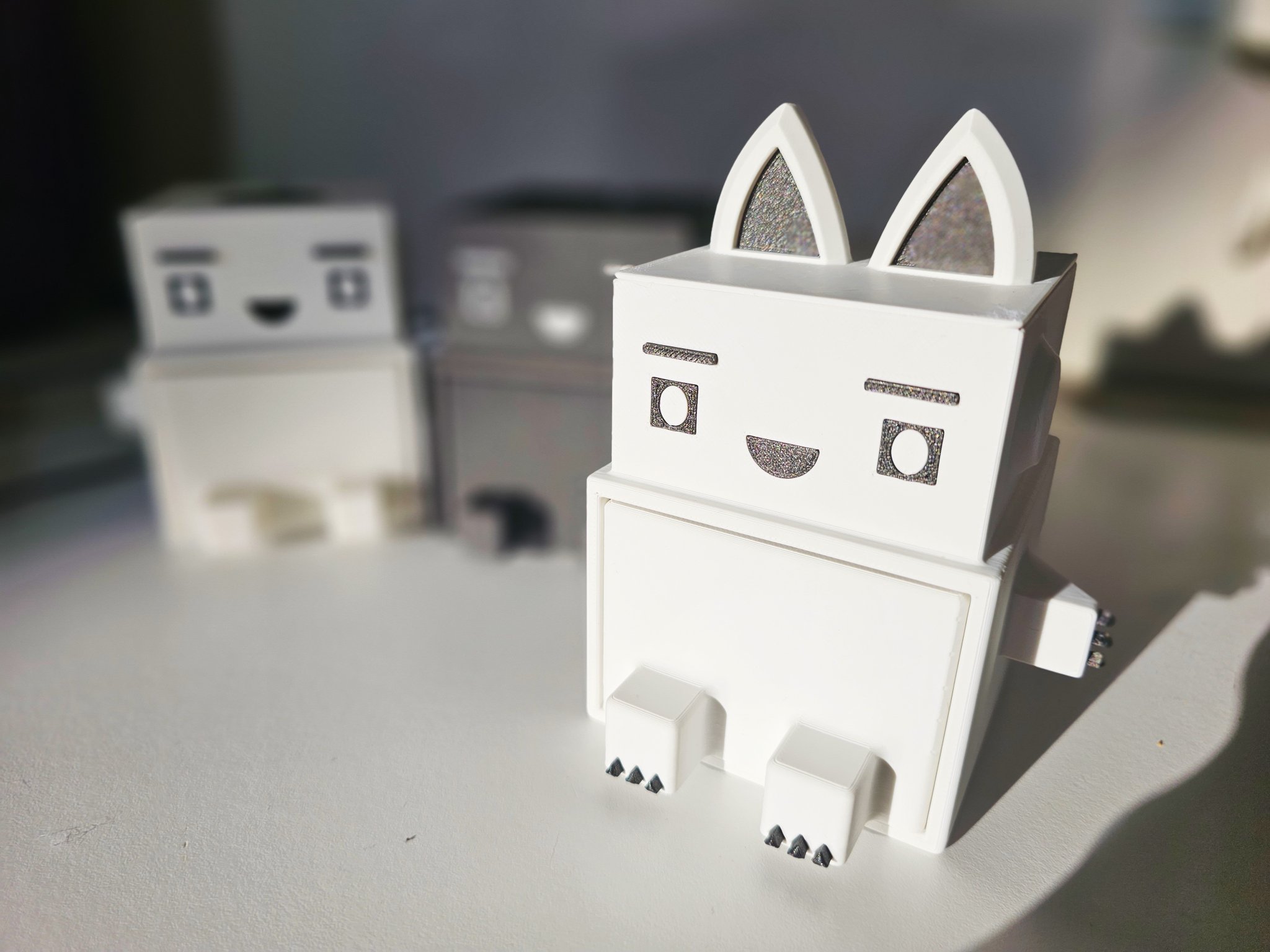 A cute Robo-cat with a lid and a small drawer to store small items.