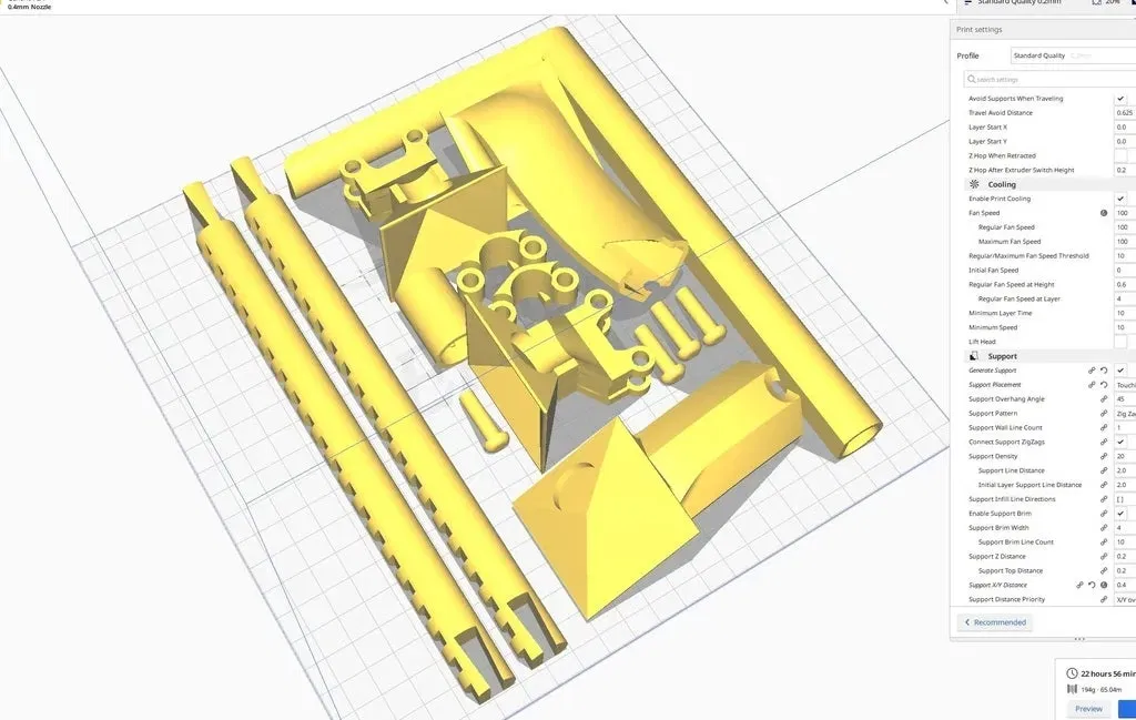 ButtV4 sẽ vừa vặn phẳng trên Ender3 (Pro). Trong Cura, hãy sửa cài đặt máy của bạn từ 220mmx220mm thành 230mmx230mm và xoay mô hình một chút cho đến khi vừa. Máy in Ender3 thực tế có thể sử dụng toàn bộ bàn in.