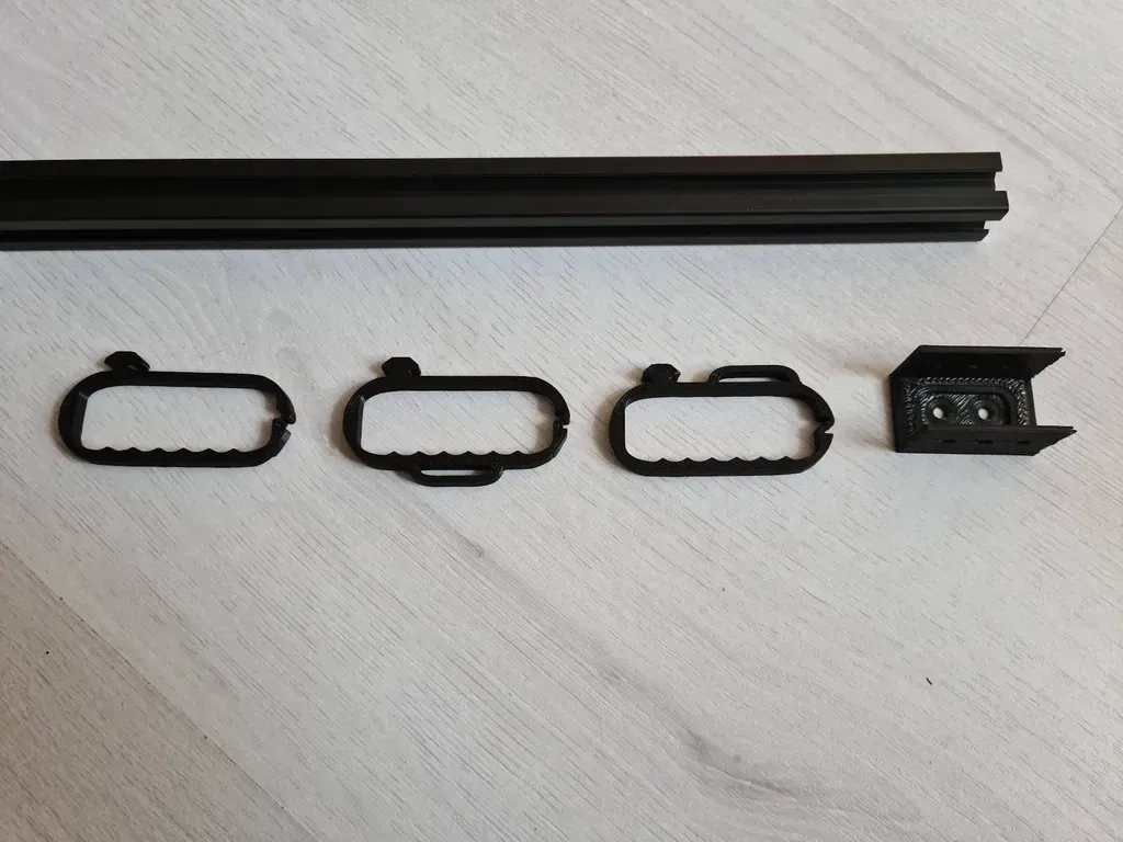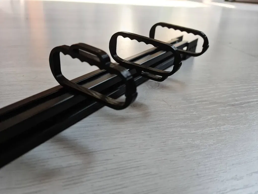 Sau đó, tui mới thiết kế cái kẹp cáp (cable-clip) nhìn cũng xinh xắn với vài biến thể có thêm vòng để xỏ dây rút (zipties) / dây dán (velcro). Hầu hết mấy cái này đều có thể xoay để gắn vô rãnh nhôm 2020. Chỉ có cái kẹp có dây dán phía trên là ngoại lệ thôi.