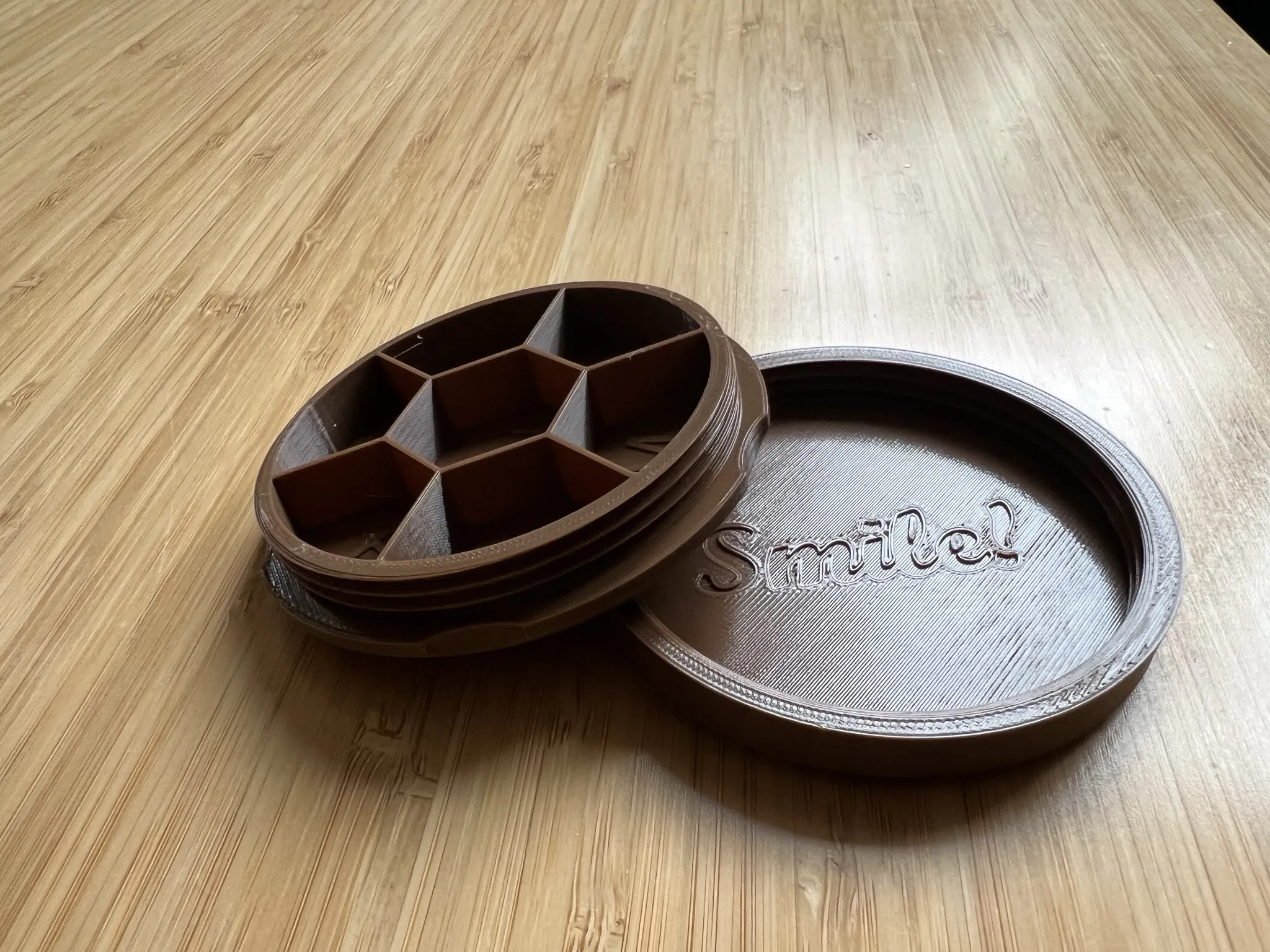 Tôi khuyên bạn nên đặt một thông điệp vui vẻ bên trong nắp của hộp chứa, như “Cười lên” và bạn có thể đặt một cái tên ở trên cùng bằng eSlicer 2.6.0.