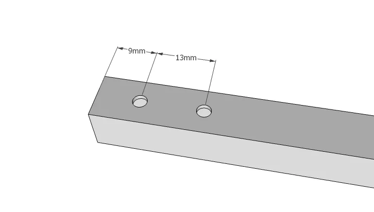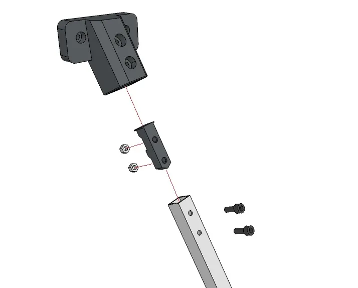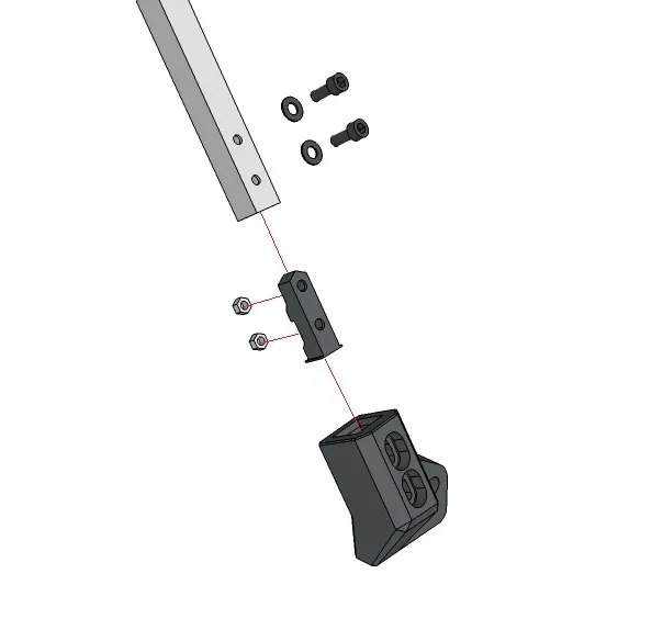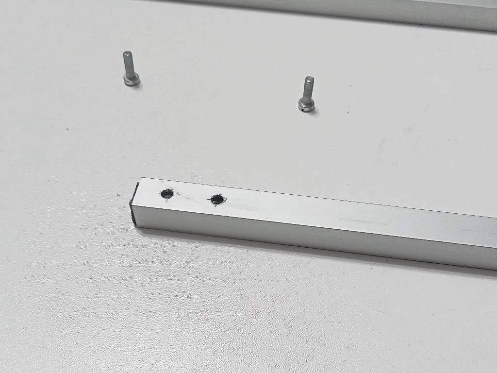 Thanh nhôm profile phải được khoan bằng mũi khoan 3mm, xem hình ảnh để biết vị trí lỗ. Đầu tiên lắp các 'khung gia cố' với đai ốc lục giác, sau đó chúng được lắp vào thanh nhôm profile (căn chỉnh đai ốc với lỗ khoan).