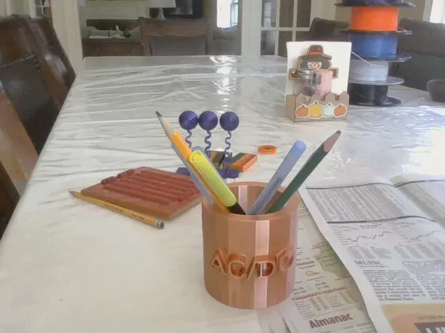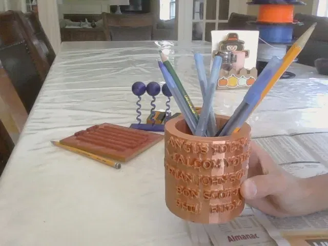 một giá đỡ bút có AC/DC ở phía trước và Malcom Young, Angus Young, Brian Johnson, Bon Scott và Phil Rudd ở phía sau.