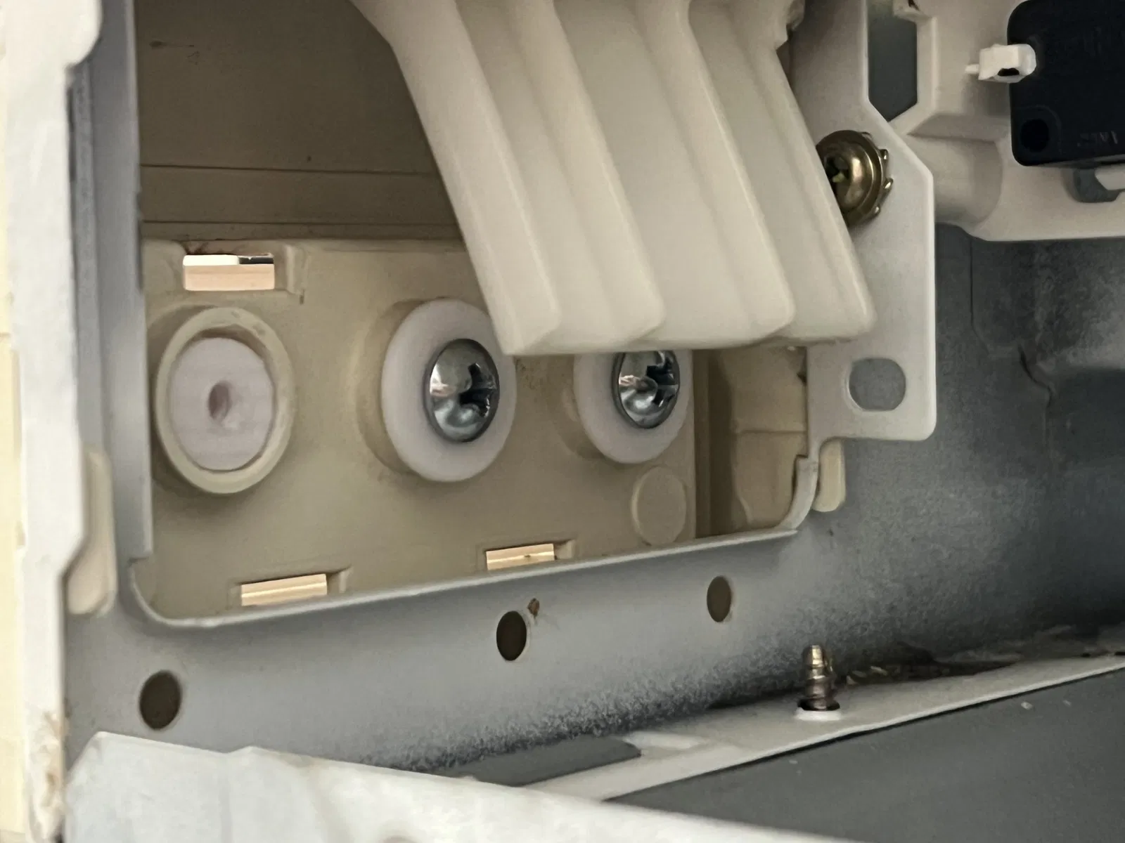 The small tabs on the back of the door release button broke off, so I designed a new one. Rather than use the flimsy tabs, this model is held in with two screws and washers. I just used a few short screws that I had lying around. I printed some washers so the screws keep the button from falling out.