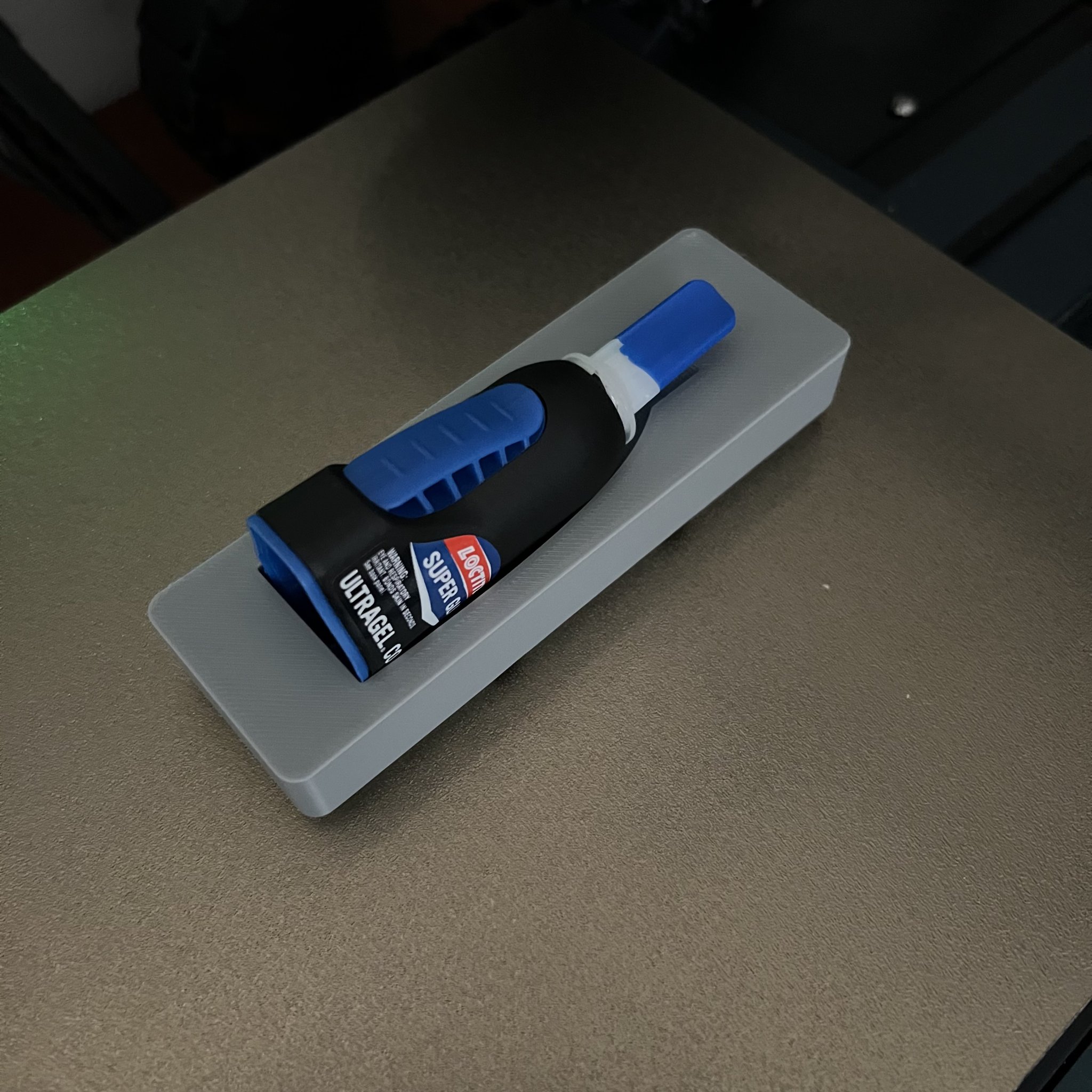 3x1x3 gridfinity box that holds a Loctite Super Glue bottle horizontally for slim drawers. Includes magnet holes.
