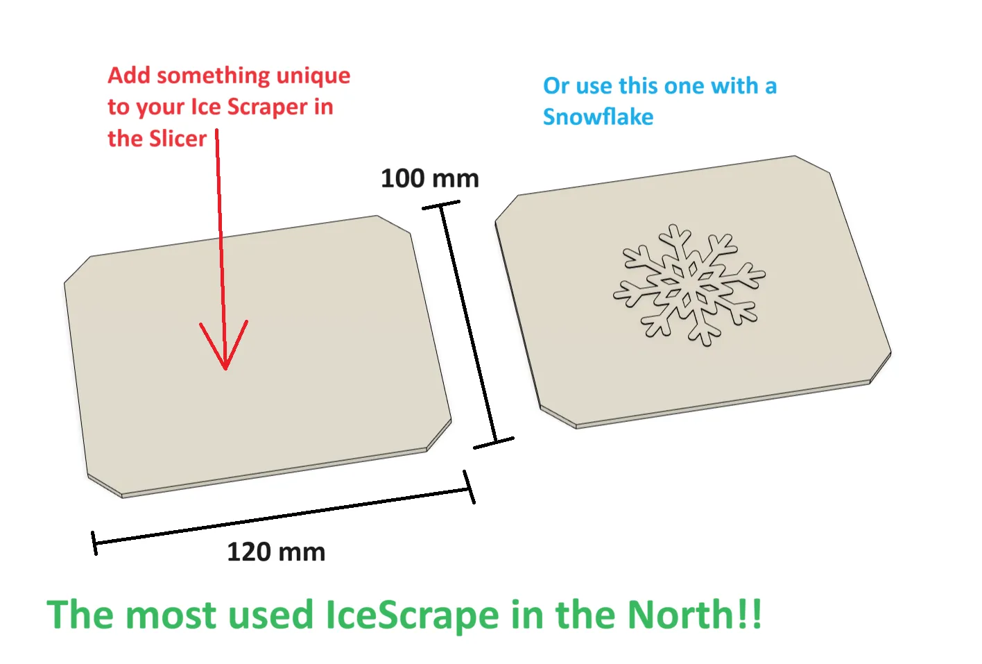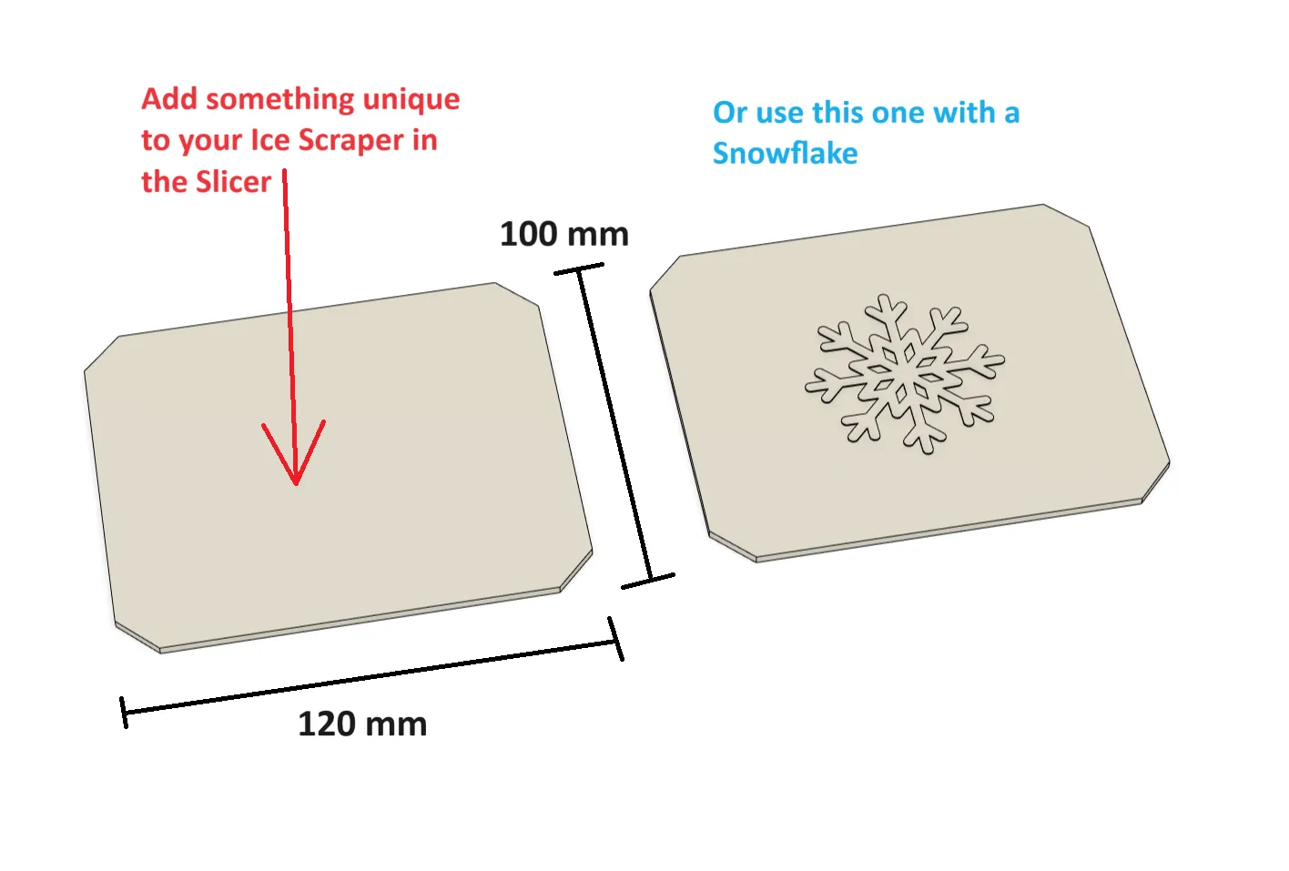 Phiên bản dụng cụ cạo đá thông thường, với khả năng cá nhân hóa khi in. Có hai lựa chọn: một phiên bản trống và một phiên bản có họa tiết bông tuyết. Phiên bản đã slice sẵn có 25% infill, bạn có thể tùy chỉnh thêm theo ý thích.