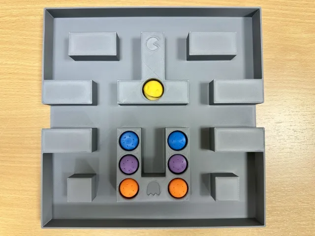 Mô hình sân chơi dạng mê cung được thiết kế riêng cho các nhân vật Pacman và ma. Các nhân vật Pacman và ma đi kèm được phóng theo tỷ lệ phần trăm nhỏ để phù hợp với kích thước sân chơi.