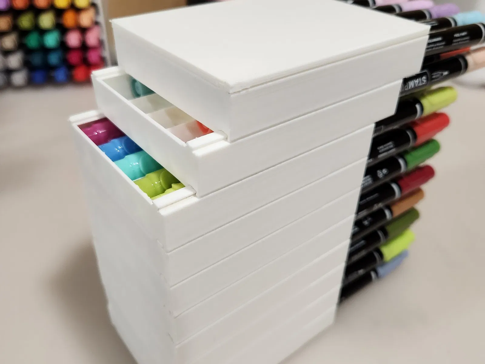 Khay đựng bút marker dạng xếp chồng với khớp nối đuôi én để khóa chúng lại với nhau. Thiết kế cho bút Stampin Up hoặc tương tự, phù hợp với đường kính dưới 13mm. Có đế đi kèm để làm bệ đỡ hoặc kết hợp theo ý muốn. Khuyến khích in dọc và có thể cần thêm lớp brim. Phần nắp in úp xuống để có bề mặt đẹp nhất. Các khớp nối đuôi én khá khít, có thể cần chỉnh sửa nhẹ để dễ dàng trượt.
